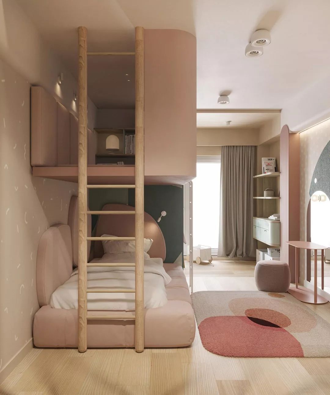 孩子的卧室是一个奇妙的空间,由粉状的彩色层、形状优美的面板、墙壁装饰建成,粉色地板床被赋予了独特的床头板和壁板设计,看起来像巨大的粉色鹅卵石,上面的一个游戏铺位隐藏在椭圆面后面,激发孩子无尽的探索欲望,下层用来睡觉,休息玩耍两不耽误。