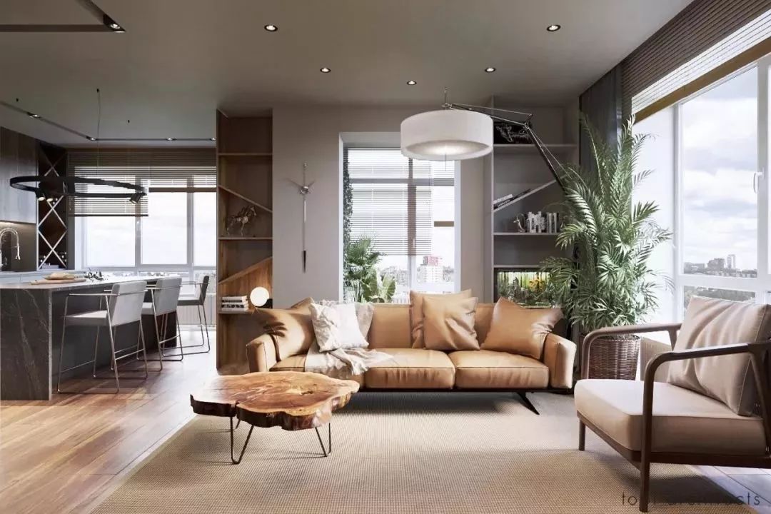 开放式成主旋律 相较于以前被割裂的功能区设计,90后的客厅,展现出花样百出的开放式设计。可以说,除了卧室与卫生间之外,其他区域大多保持开放式,与客厅直接相连!而这些年最 Fashion 的空间布局,莫过于客、餐、厨、阳台一体化了。