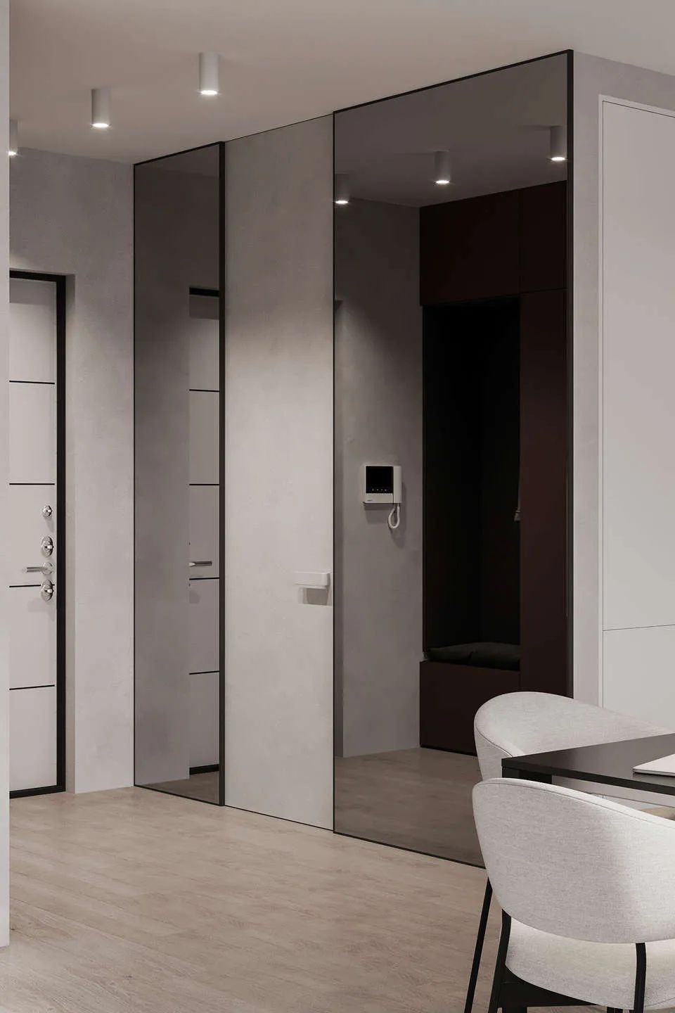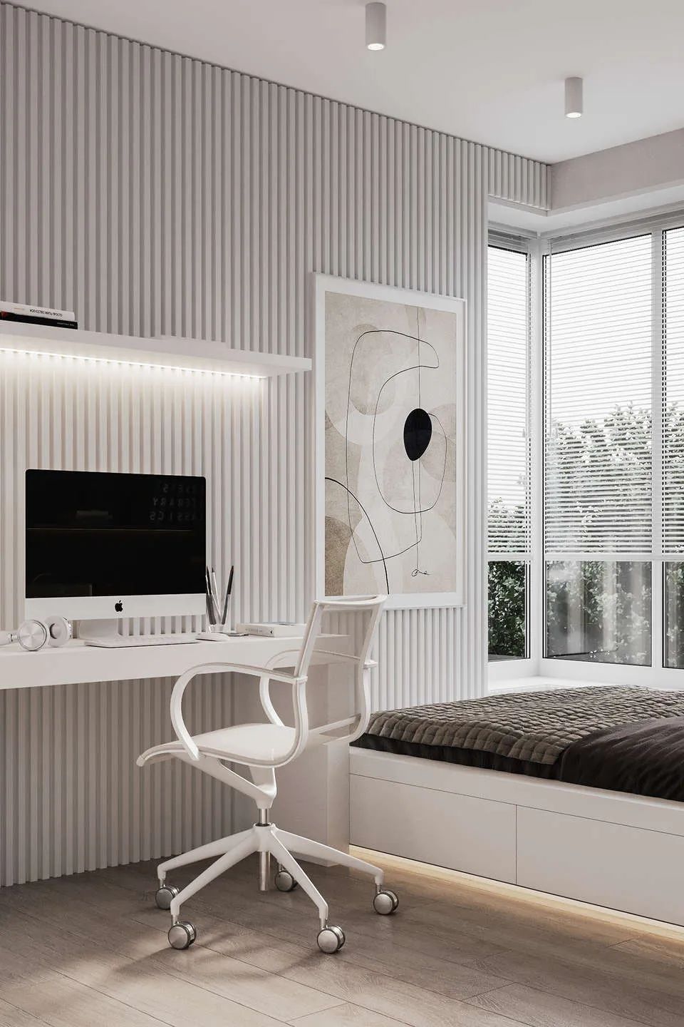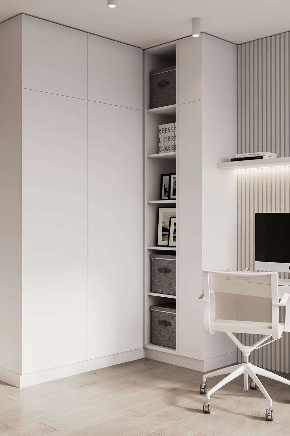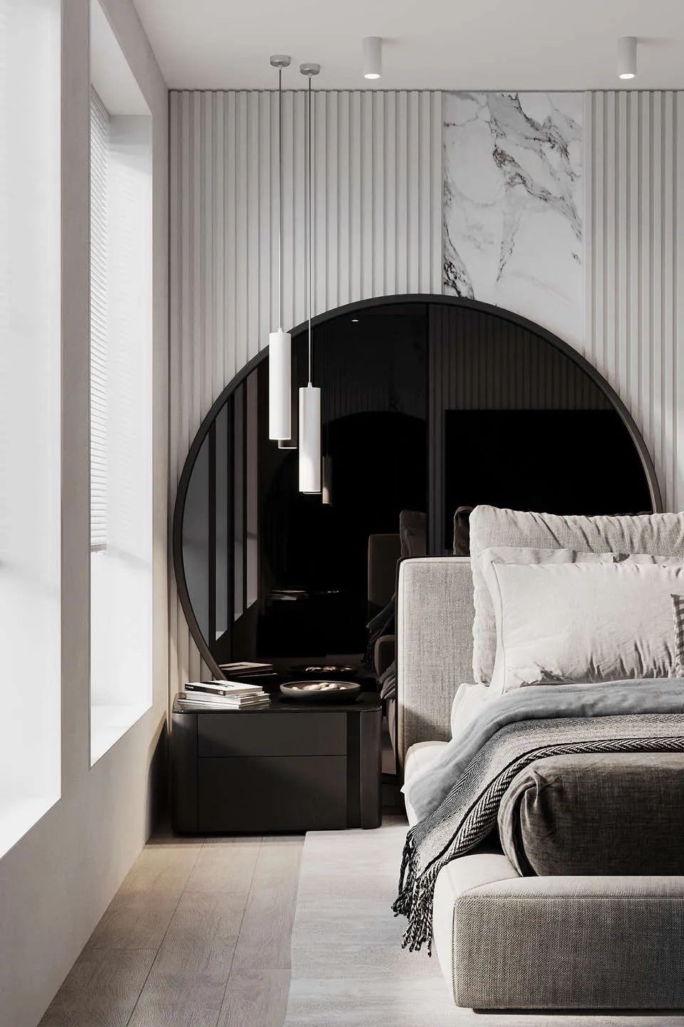 黑色哑光洁具内嵌在水磨石上,自然优雅的清洗空间由此呈现。 玄关区,设计清爽俐落,没有过多的装饰,视觉中足够的留白,显与隐,互相作用。 打开柜门,内有乾坤。挂衣、储鞋、照镜,可满足业主多种需求。 主卧的设计,不作浮华堆砌,只用干净洗练的线条建立一个清简恍如只隐约存在留白的空间关系,辅以卡拉卡塔白大理石瓷砖,任由素白营造一个心灵可以完全放空的环境。 右侧黑色烤漆圆盘打破了空间规整调性,其不仅美观还能反射吊灯光源,晚上空间光线会被镜面调和的更柔和。 次卧,是男主待的比较多的一个区域,设计师在紧挨飘窗内侧设计了一个干净、整洁的工作区。