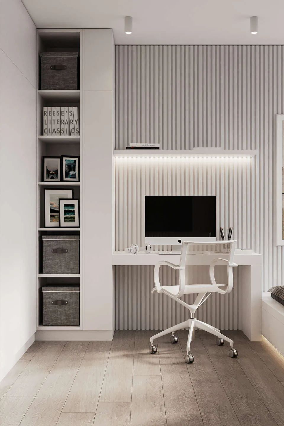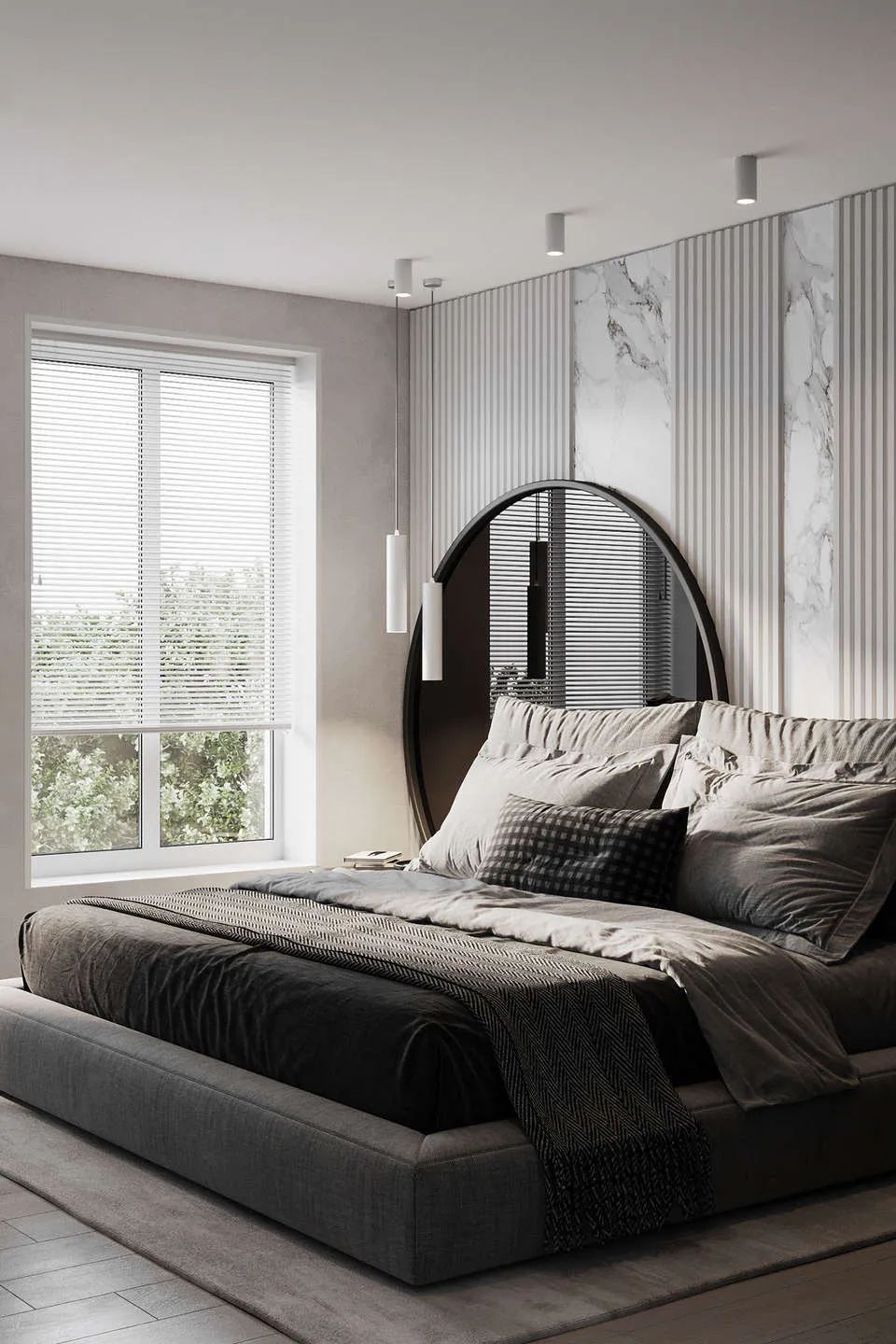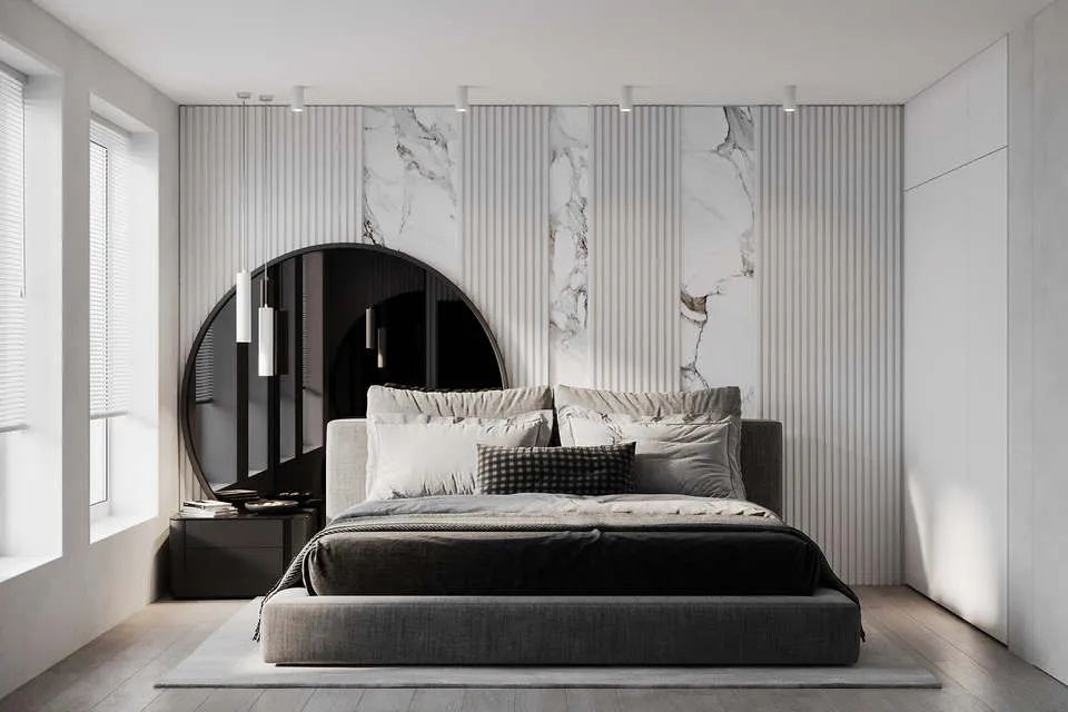 黑色哑光洁具内嵌在水磨石上,自然优雅的清洗空间由此呈现。 玄关区,设计清爽俐落,没有过多的装饰,视觉中足够的留白,显与隐,互相作用。 打开柜门,内有乾坤。挂衣、储鞋、照镜,可满足业主多种需求。 主卧的设计,不作浮华堆砌,只用干净洗练的线条建立一个清简恍如只隐约存在留白的空间关系,辅以卡拉卡塔白大理石瓷砖,任由素白营造一个心灵可以完全放空的环境。 右侧黑色烤漆圆盘打破了空间规整调性,其不仅美观还能反射吊灯光源,晚上空间光线会被镜面调和的更柔和。 次卧,是男主待的比较多的一个区域,设计师在紧挨飘窗内侧设计了一个干净、整洁的工作区。
