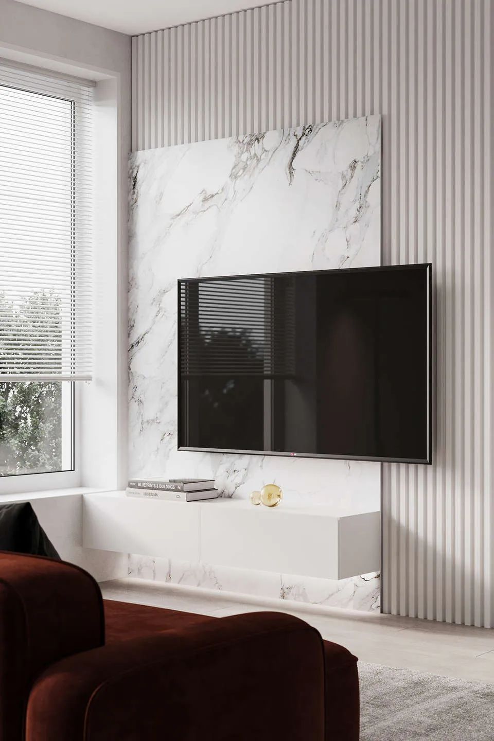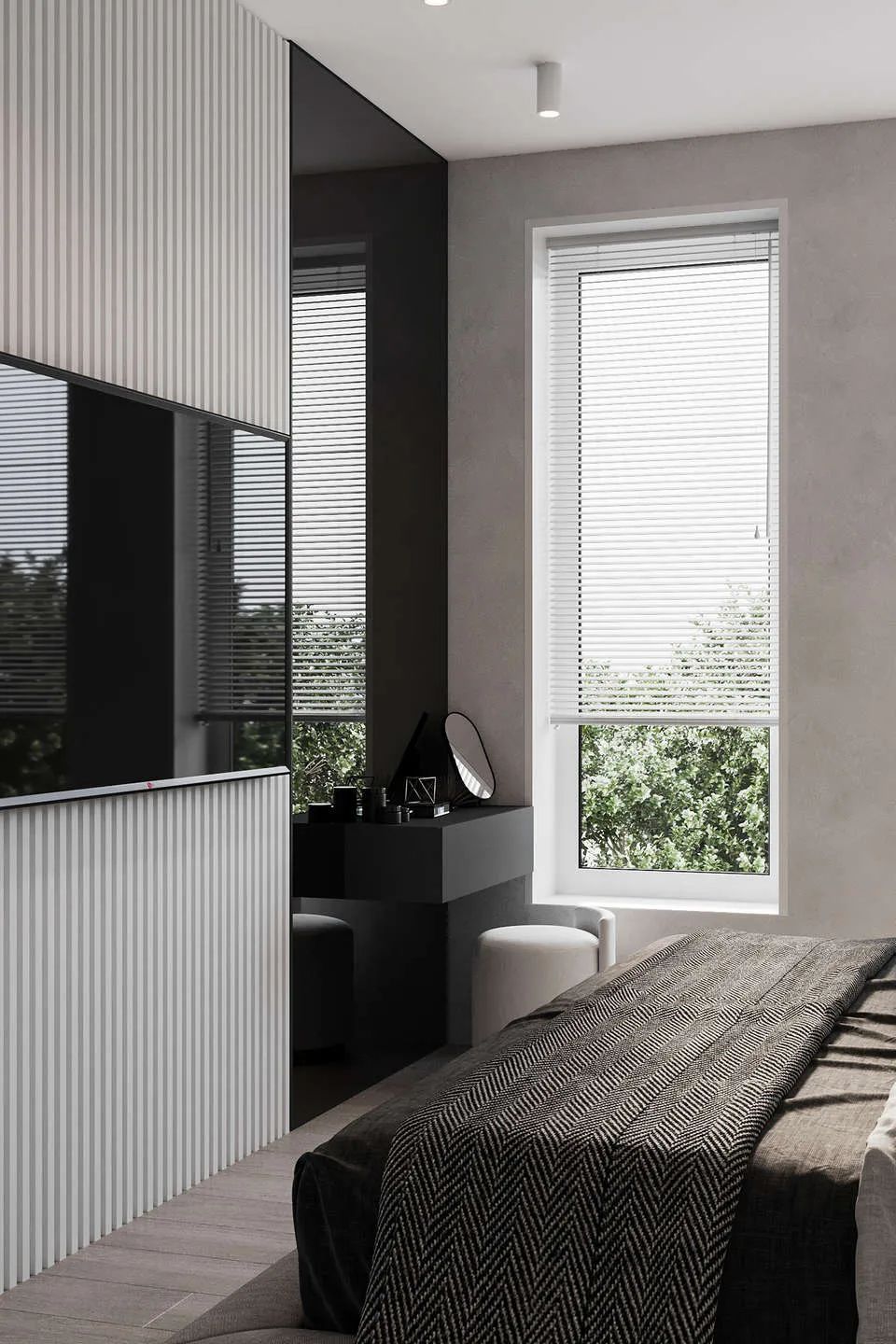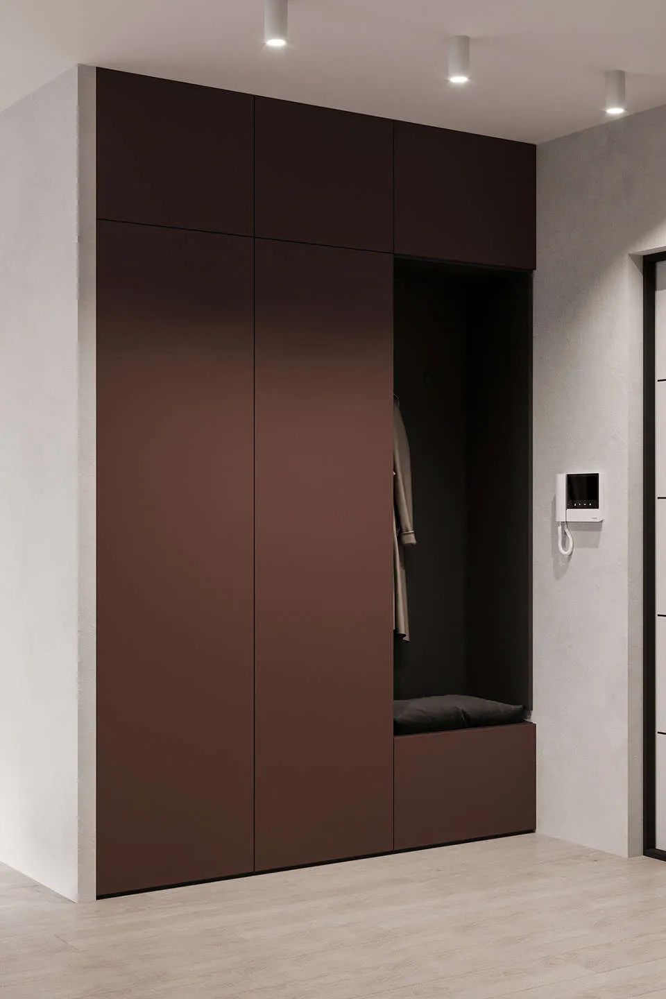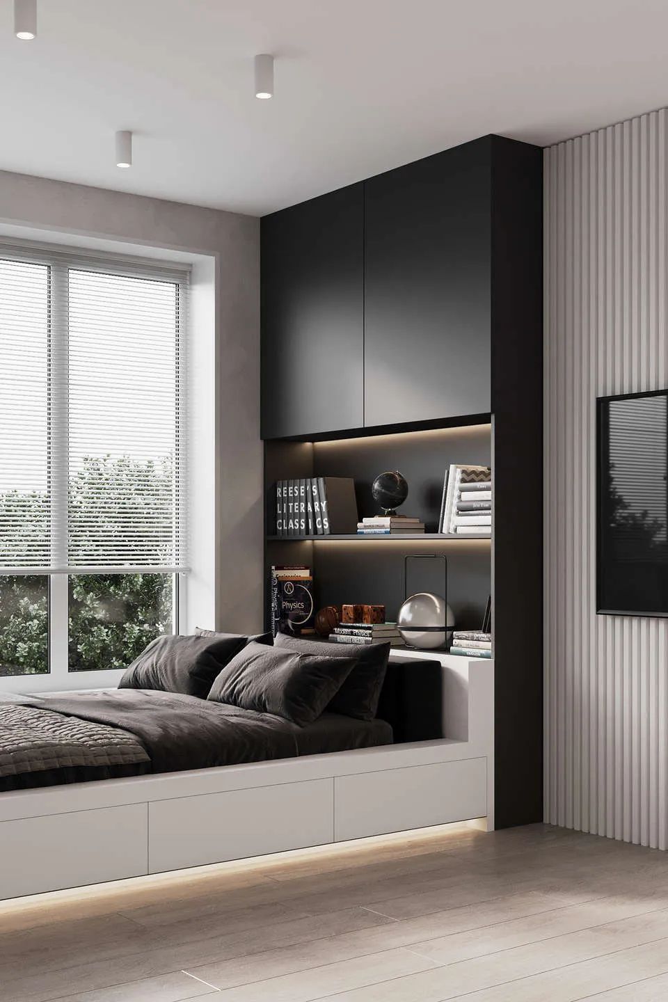 黑色哑光洁具内嵌在水磨石上,自然优雅的清洗空间由此呈现。 玄关区,设计清爽俐落,没有过多的装饰,视觉中足够的留白,显与隐,互相作用。 打开柜门,内有乾坤。挂衣、储鞋、照镜,可满足业主多种需求。 主卧的设计,不作浮华堆砌,只用干净洗练的线条建立一个清简恍如只隐约存在留白的空间关系,辅以卡拉卡塔白大理石瓷砖,任由素白营造一个心灵可以完全放空的环境。 右侧黑色烤漆圆盘打破了空间规整调性,其不仅美观还能反射吊灯光源,晚上空间光线会被镜面调和的更柔和。 次卧,是男主待的比较多的一个区域,设计师在紧挨飘窗内侧设计了一个干净、整洁的工作区。