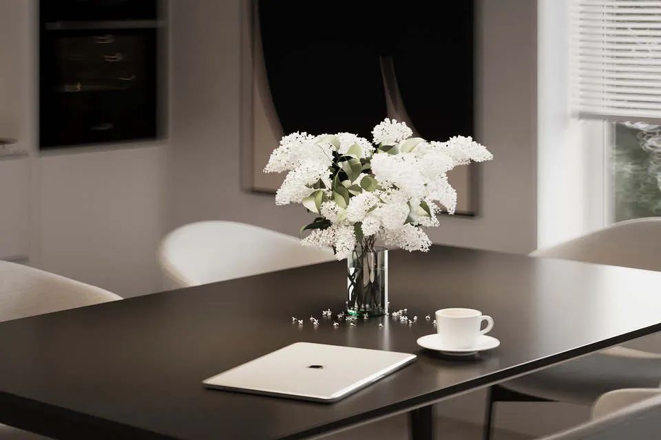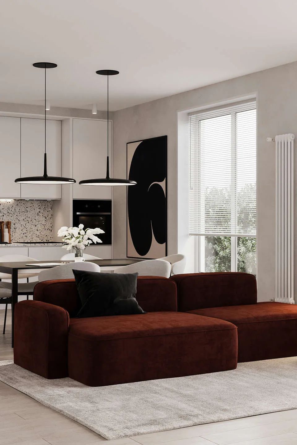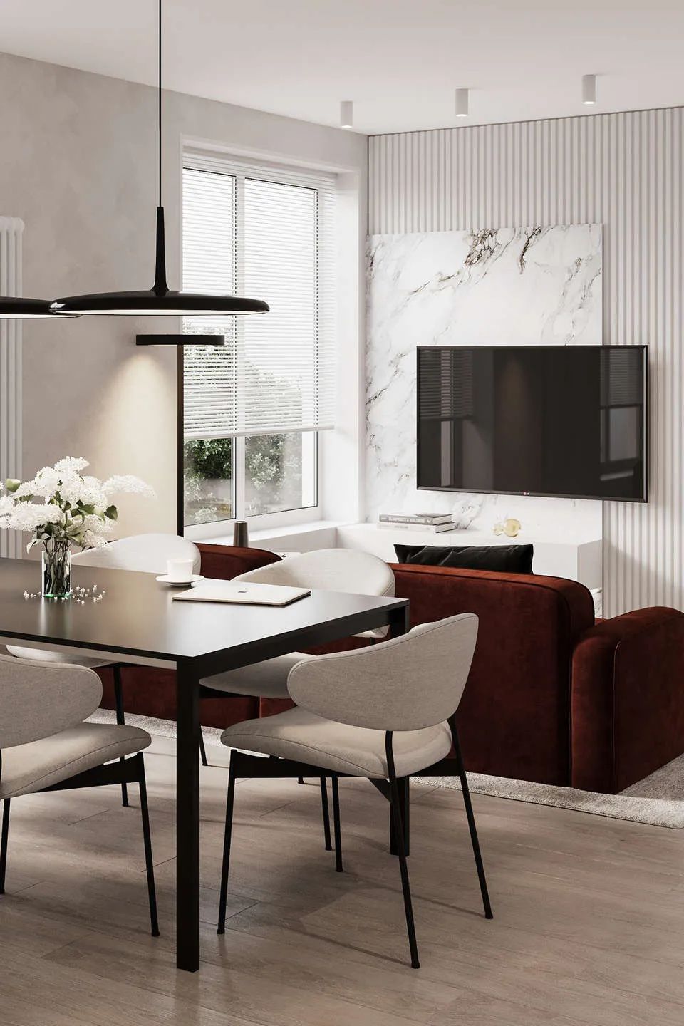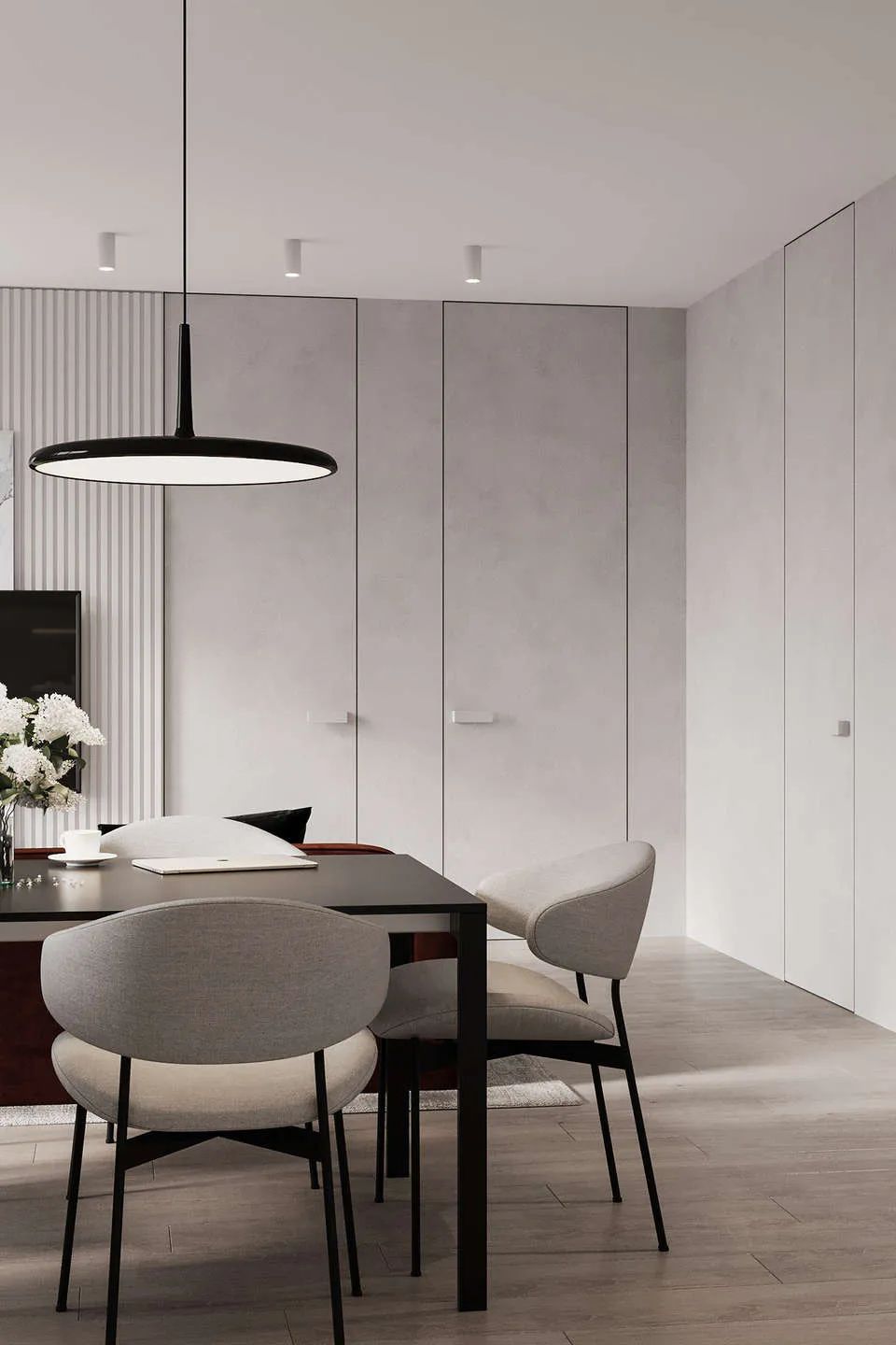 客厅的时尚,餐区的清爽,极具艺术张力线条,在喧嚣的都市中心,让此处透出雅致的浪漫。 设计师选取酒红色沙发为客厅视觉焦点,其与周围白色碰撞出时尚与品质感,一面严谨,一面浪漫,细节之下,精致满满。 餐厅的一桌、一椅,凝聚着空间的形与神。超薄餐桌与布艺餐椅的搭配,唤醒了餐厅的活力。 为了让空间整体保持一致性,室内一律选取无门框通顶门,外观简洁,与墙面保持连贯。
