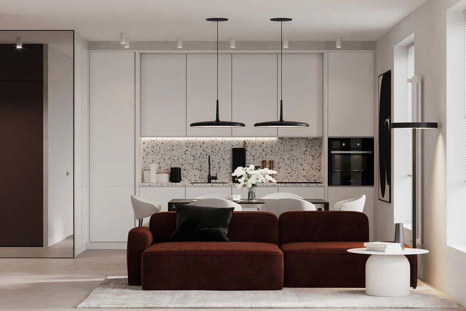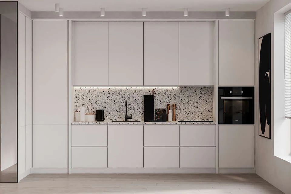 把镜头转向另一面,就到了开放式厨房区,无拉手纯白橱柜中间点缀了一面水磨石背景墙,既是焦点也是亮点。