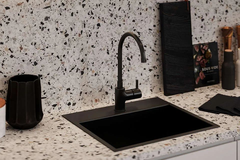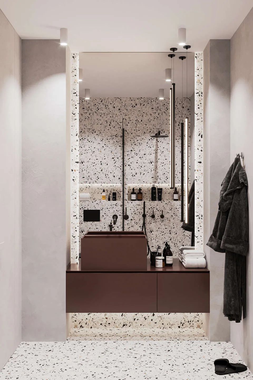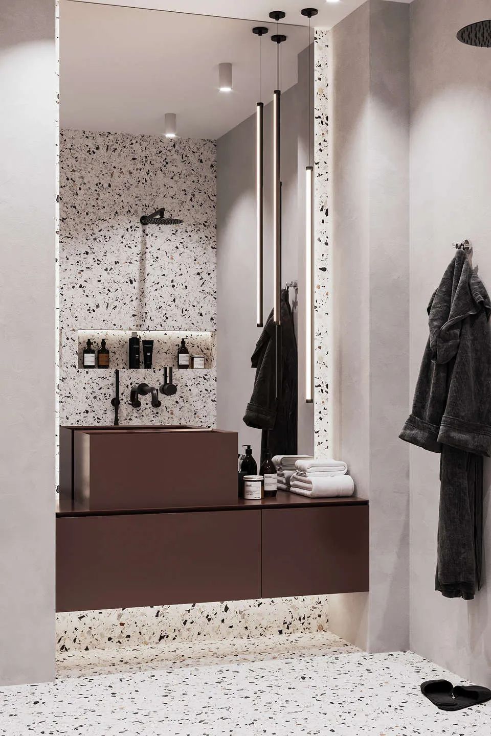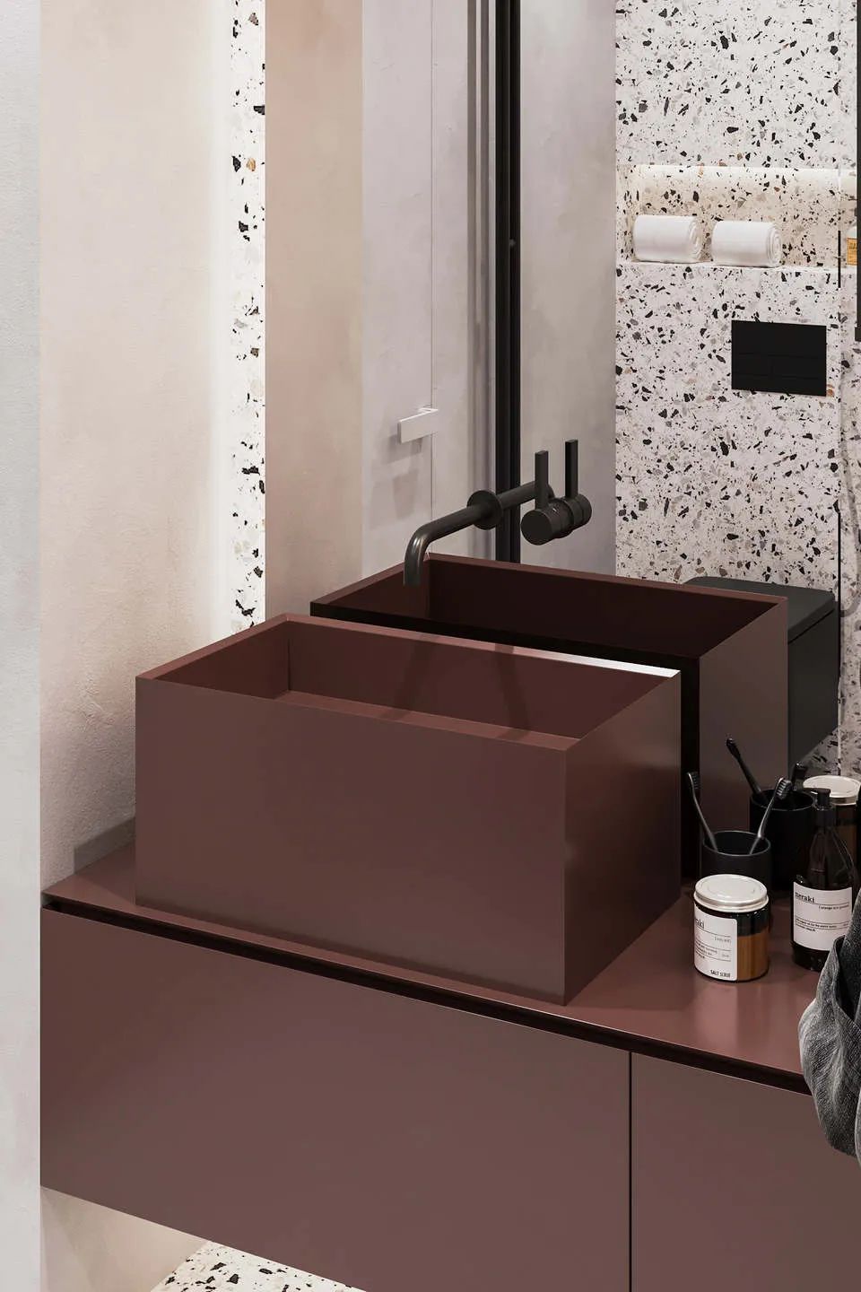 设计师为水磨石背景墙选了一款安静的暗红色台盆,其色调看上去更为清爽,与水磨石的时尚搭配不谋而合,互相成就。