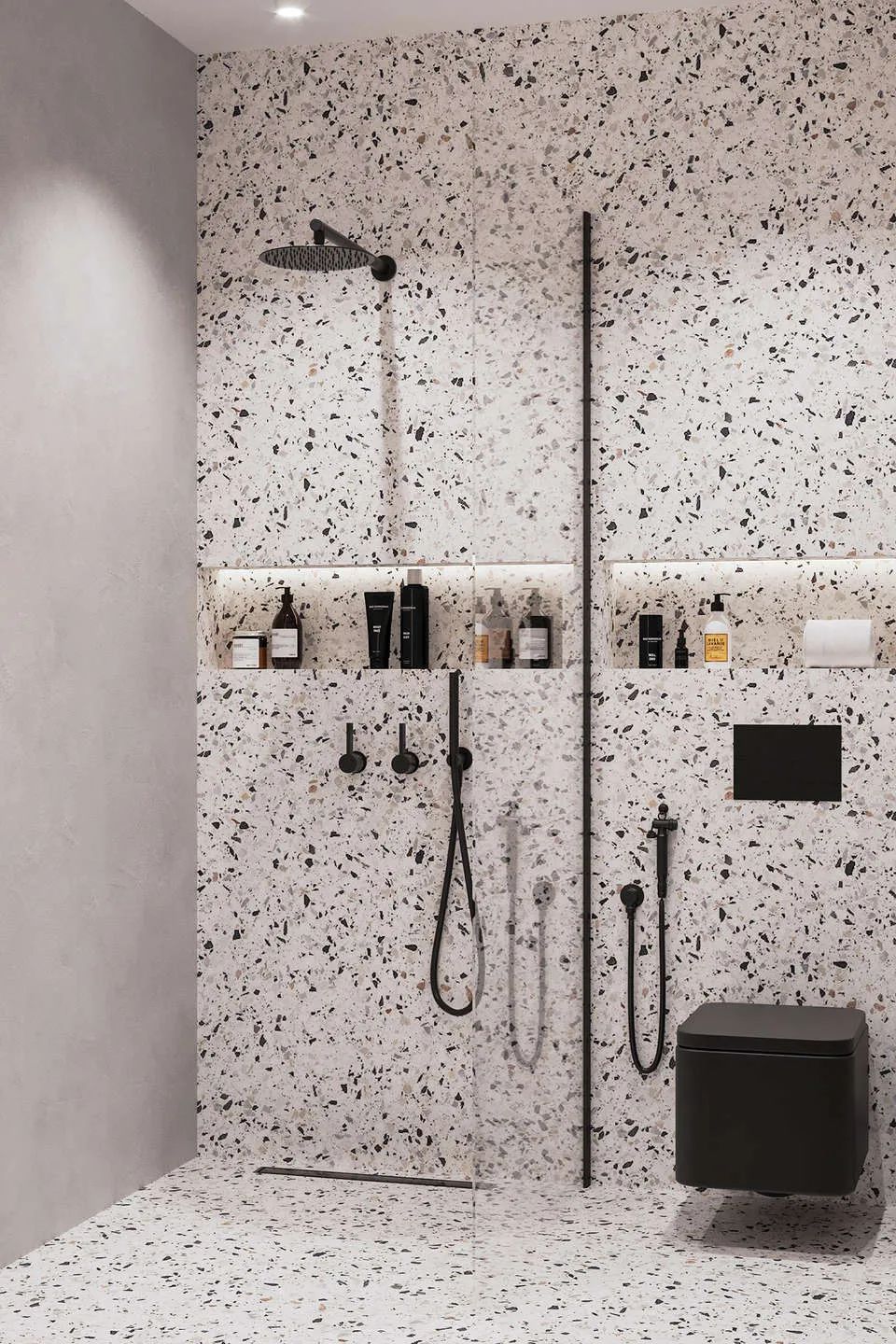 飘窗位置,光线从窗畔穿过百叶帘倾泻,留下斑驳自然光影。取一个舒适的姿势,在这里读书品茶,静享一段温暖与宁静。 公共区,卫生间仍采用水磨石呈现简洁基底,搭配黑色五金洁具,与厨房保持一致,自然连贯。