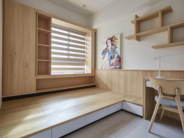 榻榻米地台既可储物,也可当睡床,也可以在榻榻米地台上放一个矮桌,铺上两个软垫,在此喝茶聊天也是极好的。