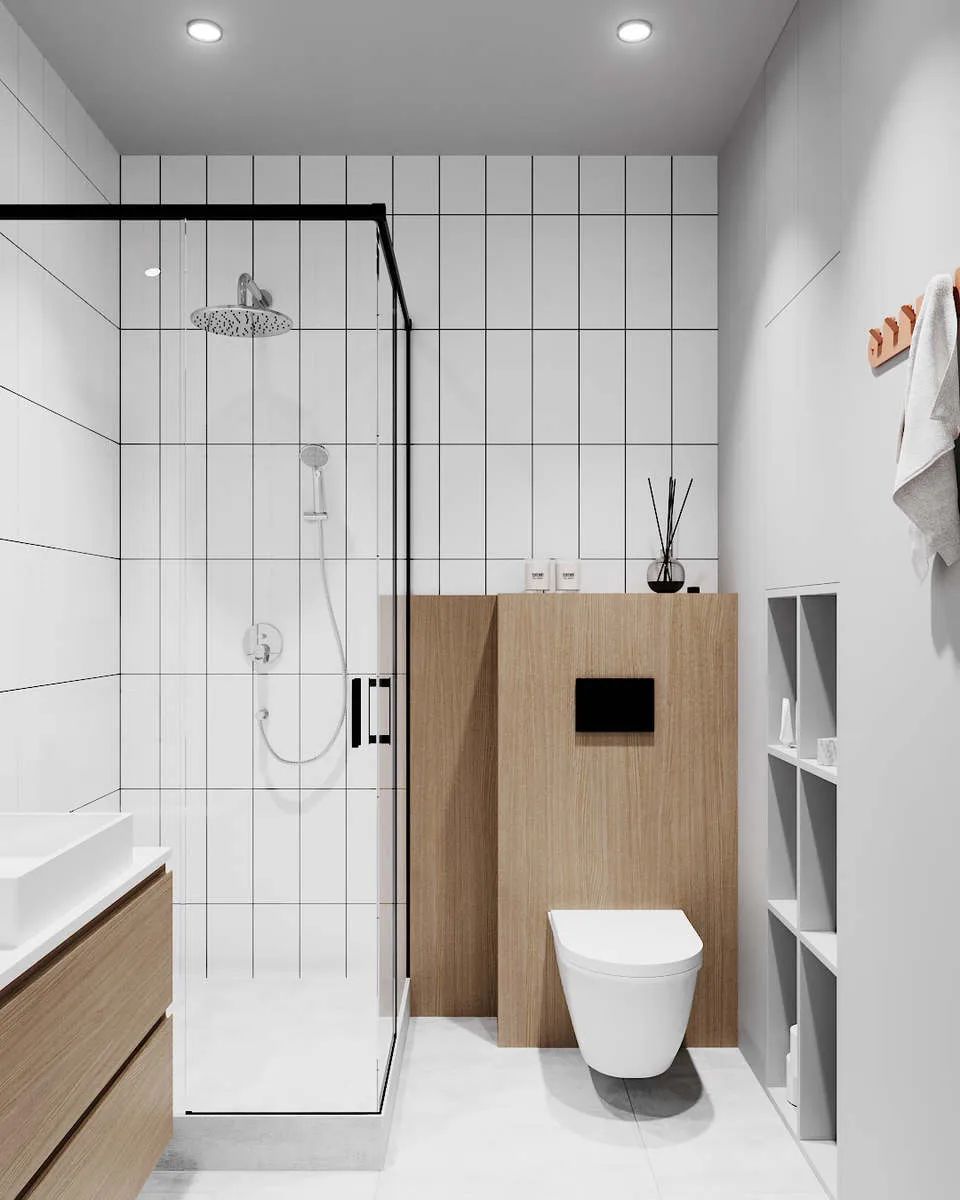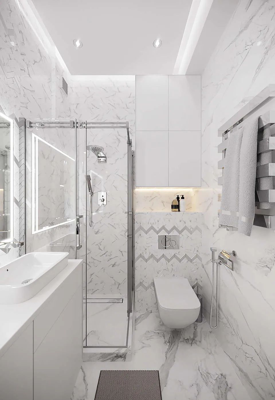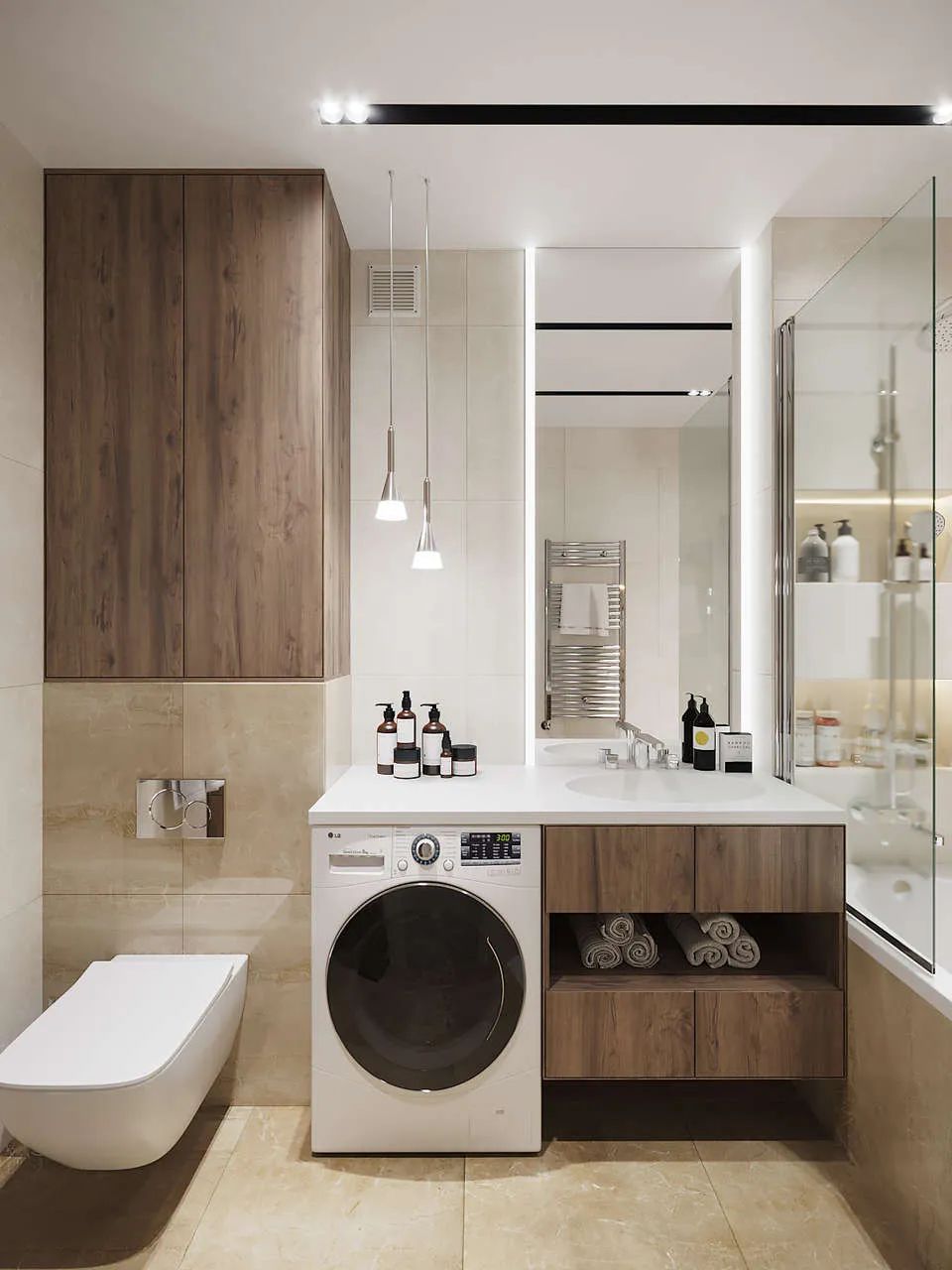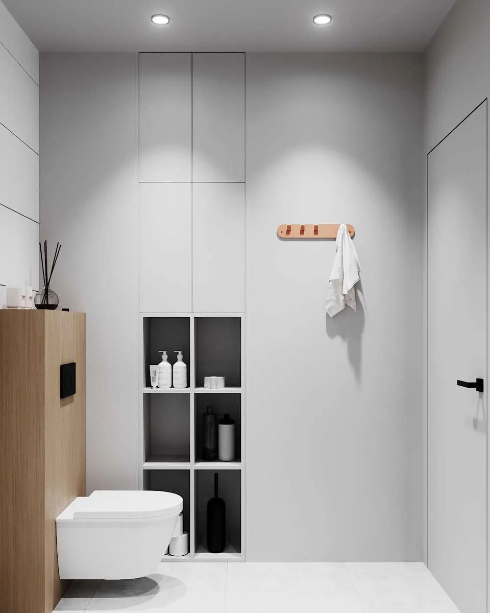 另外,墙壁夹缝也要利用好,通顶隔板放毛巾、浴巾是最好的了。 我们还可以给墙面做壁龛,换洗衣物等可以放这里。