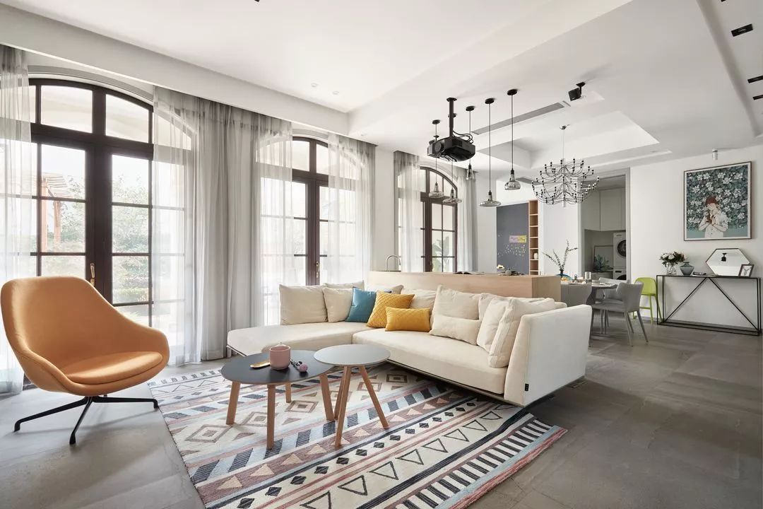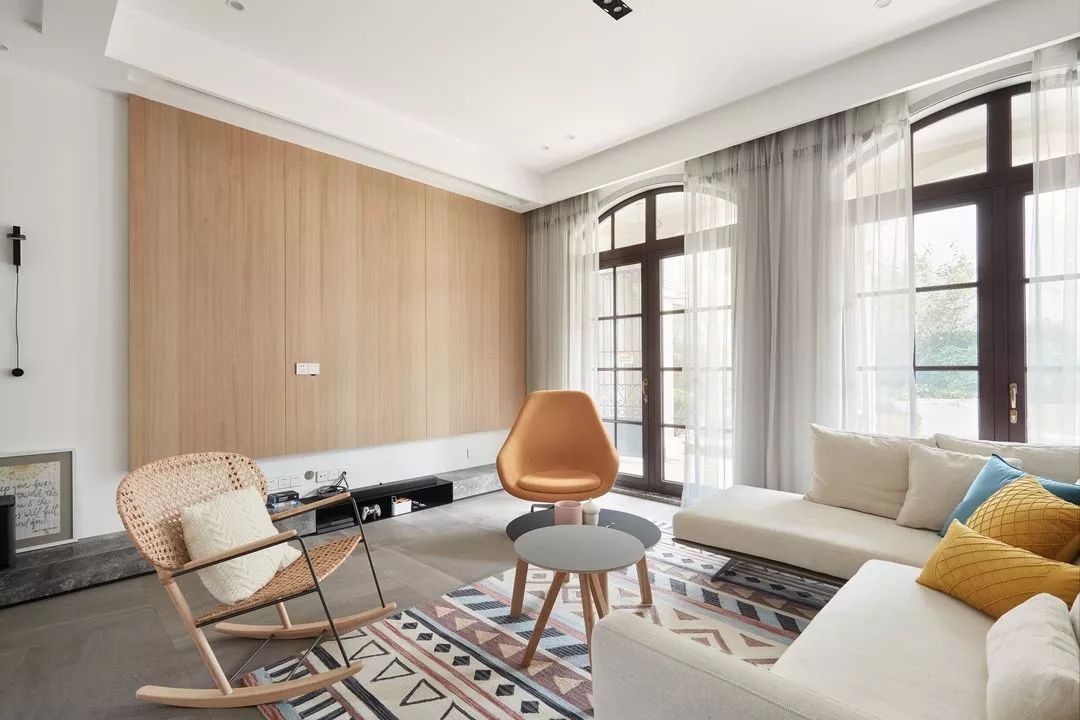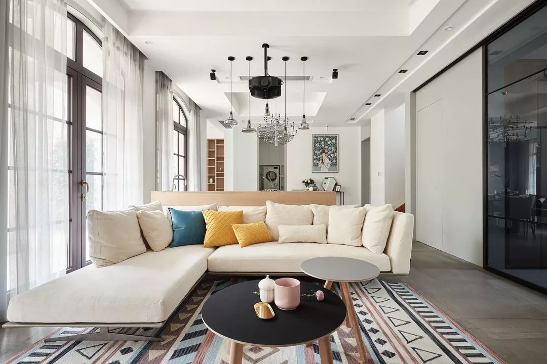 客厅用了浅色大体量沙发,可以满足多人观影。活泼的圆几便于移动和玩游戏,彩色的格纹地毯和靠包让米色的素雅空间多了一份活泼和俏皮。