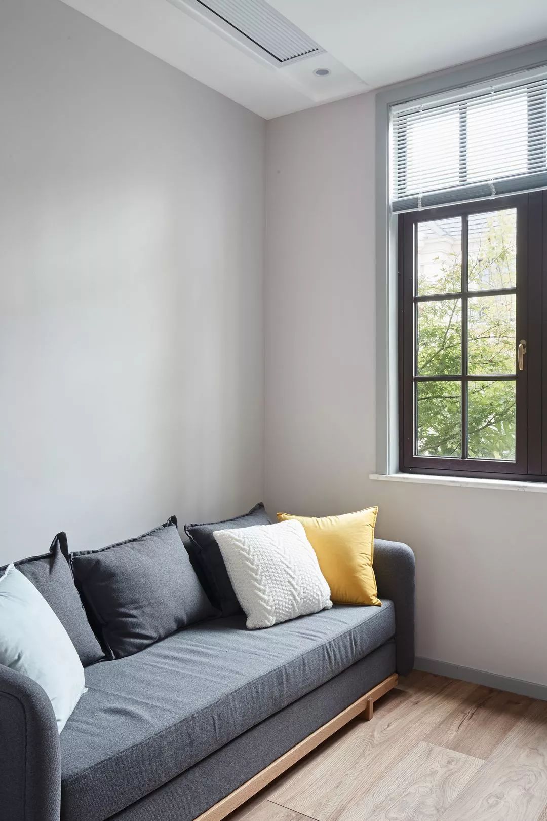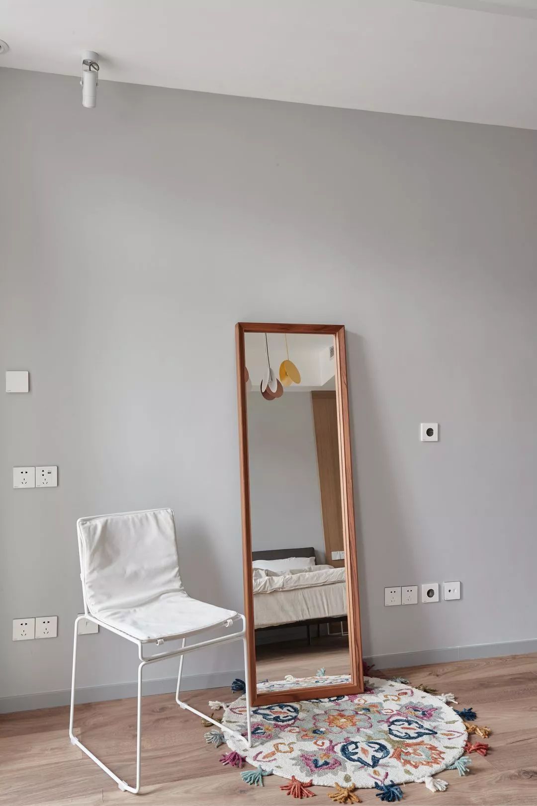 入门玄关,一侧是长凳和衣架,另一侧是整面衣帽柜。原木色的简洁家具,有一种淡然恬静的感觉,而且可以作为“消毒杀菌区”,阻断室外对室内造成的污染因素。