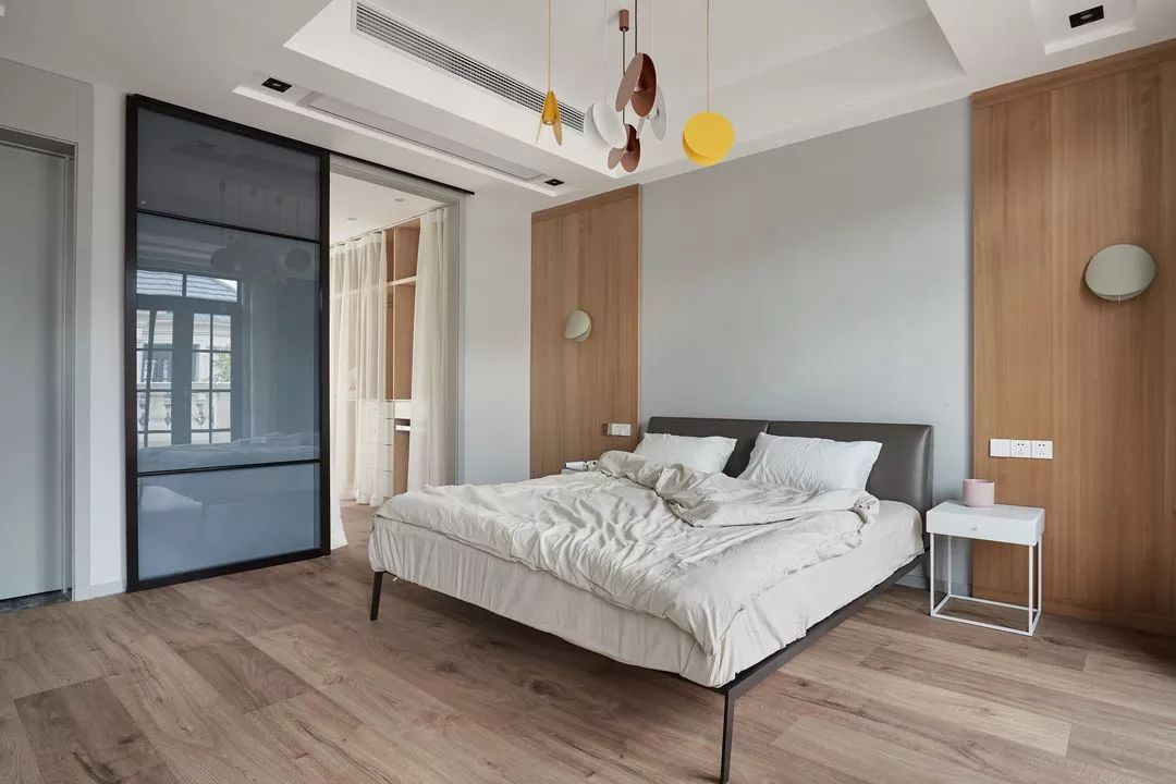 木色与白色营造出自然清新的氛围,移门后是衣帽间。家具也以简约风格为主,体现主人淡然的心境。