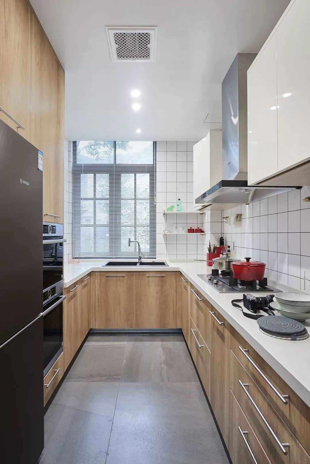 U型厨房设计,木色橱柜搭配小白砖,清新简约。