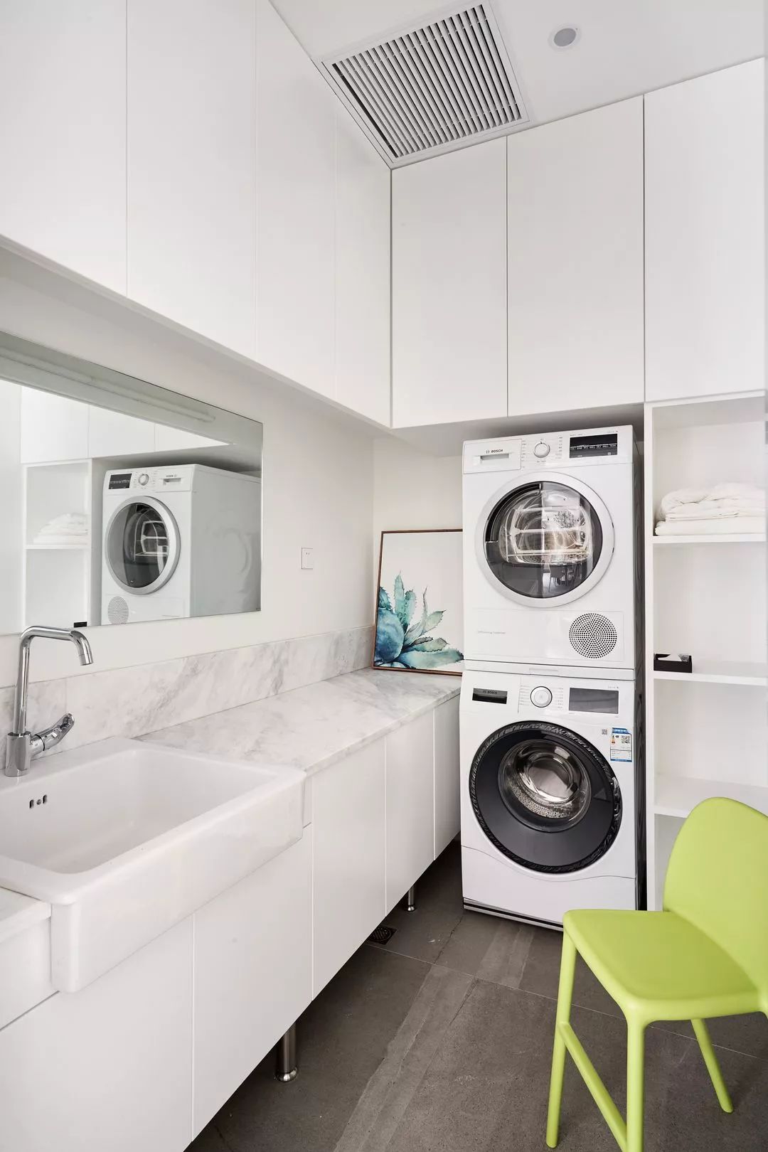 针对客户的实际需求,一楼卫生间的干区兼做洗衣房。洗衣机与烘干机搭配使用,台盆也采用了可以足够洗衣服的大尺寸,上方吊柜下面加了灯光和挂衣杆。
