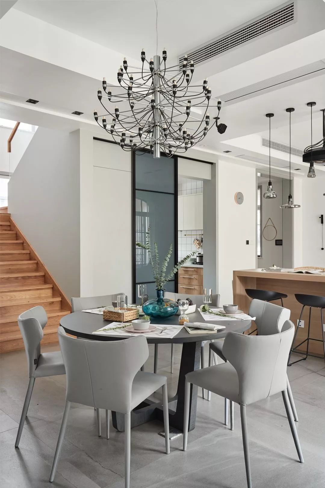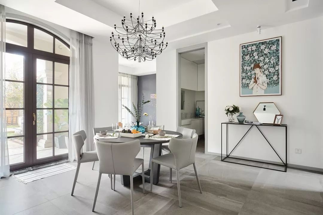黑色的餐桌搭配灰色的椅子,尽显高级之感。餐厅的吊灯是整个设计过程中最后选配的,前期没有找到特别满意的单品,最终搭配这款黑色巴洛克风格的吊灯,增添一份浪漫的气息。