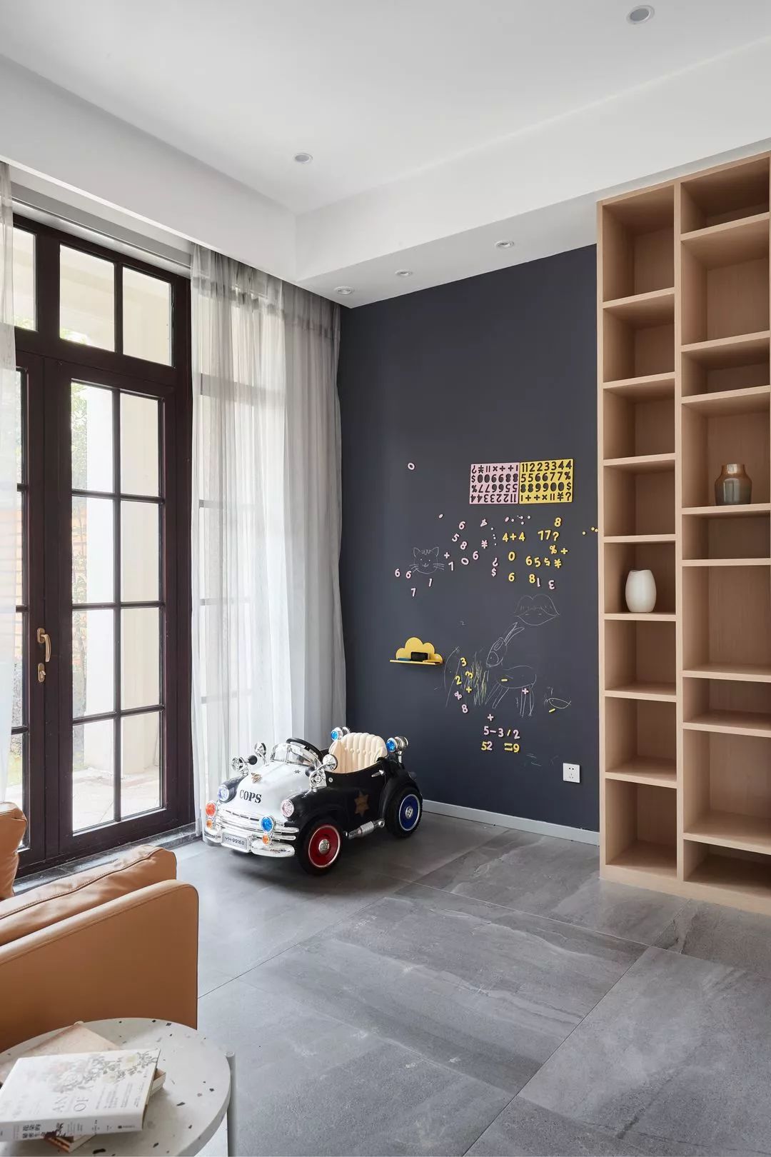 阅读区,刷了一面黑板墙,便于小朋友写写画画。一旁的搁架可放置常看的书籍。