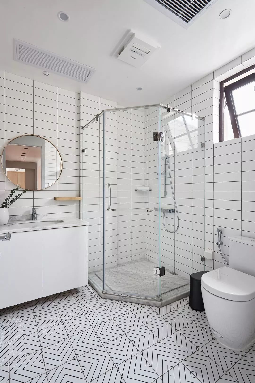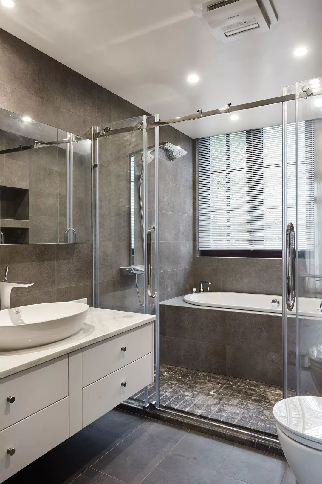 主卧卫生间选择灰黑色调瓷砖搭配白色浴室柜,营造低调内敛的感觉。