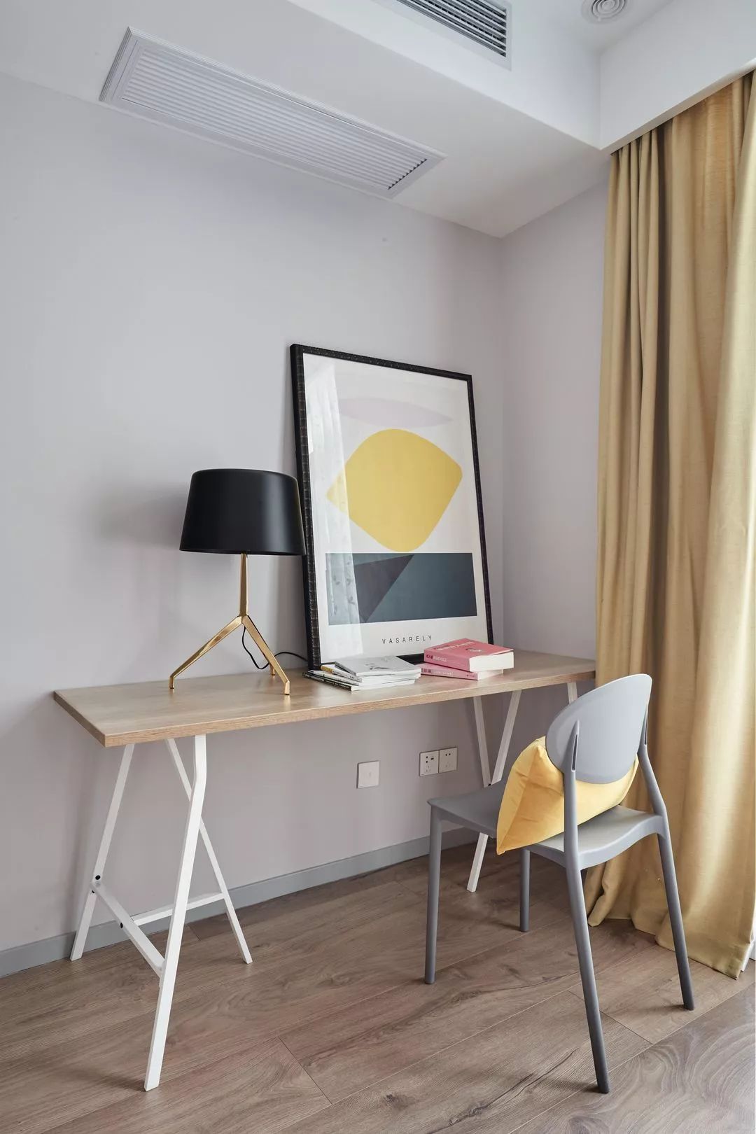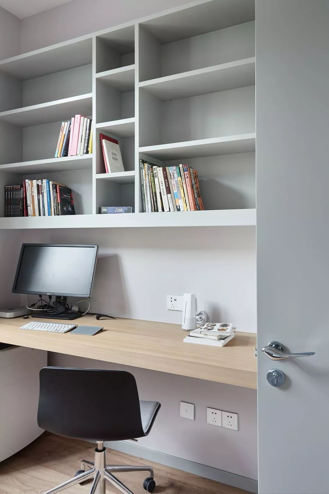 定制的工作台与书架,大大增加了藏书空间,原木色台面与白色柜体,延续房间的整体风格。