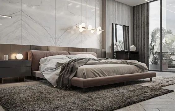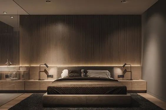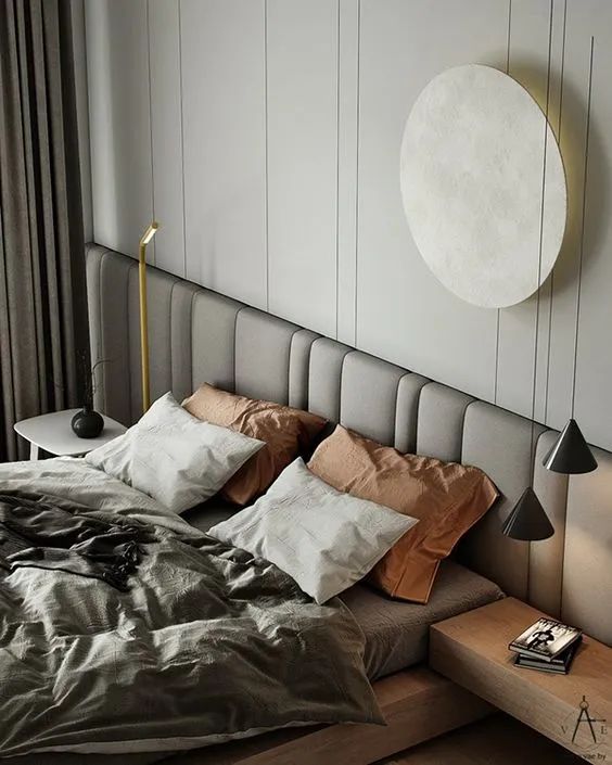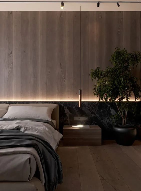 值得一提的是,木色系以及灰色系的使用能使卧室更有质感,木色的自然和灰调相互呼应,共同营造大气放松的卧室氛围。