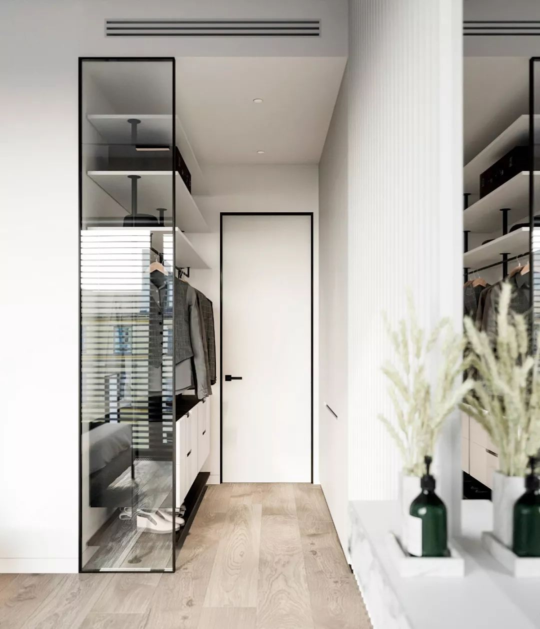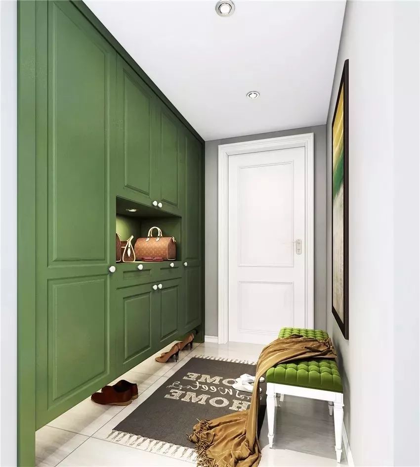 门厅的整齐有效,是很关键的。很多人不要陷入一种误区,认为“花里胡哨的玄关能营造豪华感”。再考虑实用性的时候,还要考虑美观。鞋柜,衣帽架这些东西很好都是定制的,而且隐蔽性要比较好。这样才能和屋内的其他装修达到统一的效果。