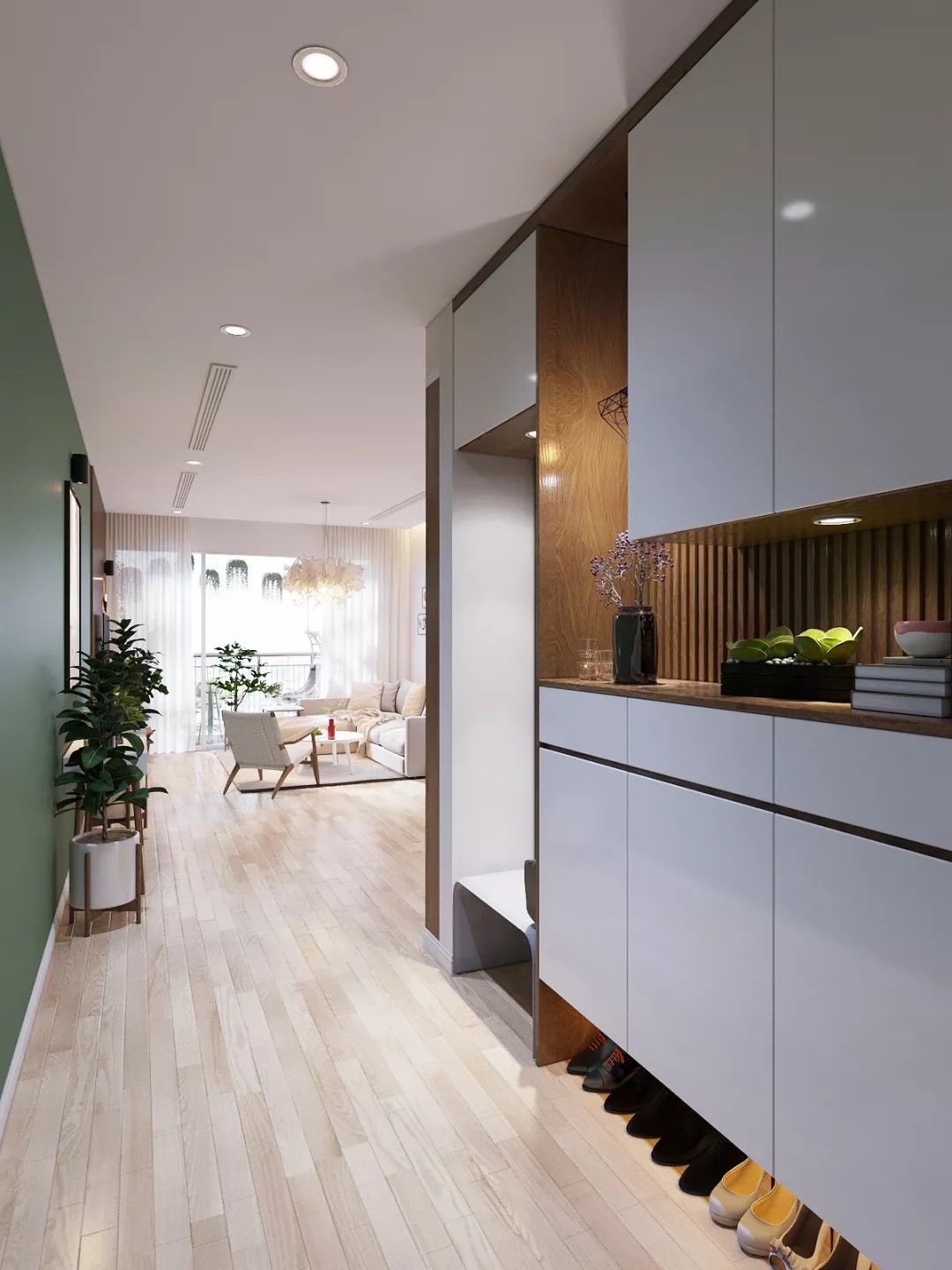 感应灯可以多设计几个,在门厅的顶部,鞋柜的内部都可以设计上感应灯。这样可以让人一打开房间,都能有家的感觉。而且分层、分区的设计形式,也多了一些现代感,不需要人为去打开灯光,就可以享受便捷的灯光效果。