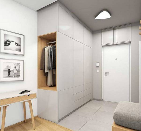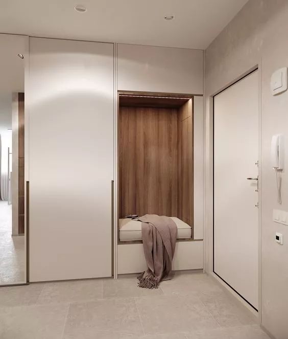 嵌入式壁柜是节省空间的利器,在设计之初,它往往和进门处的吊顶连接在一起,不仅外观看起来简约大气,而且拥有十分充足的内部收纳空间,可以将衣服、鞋帽、包包等杂物统统隐藏起来。