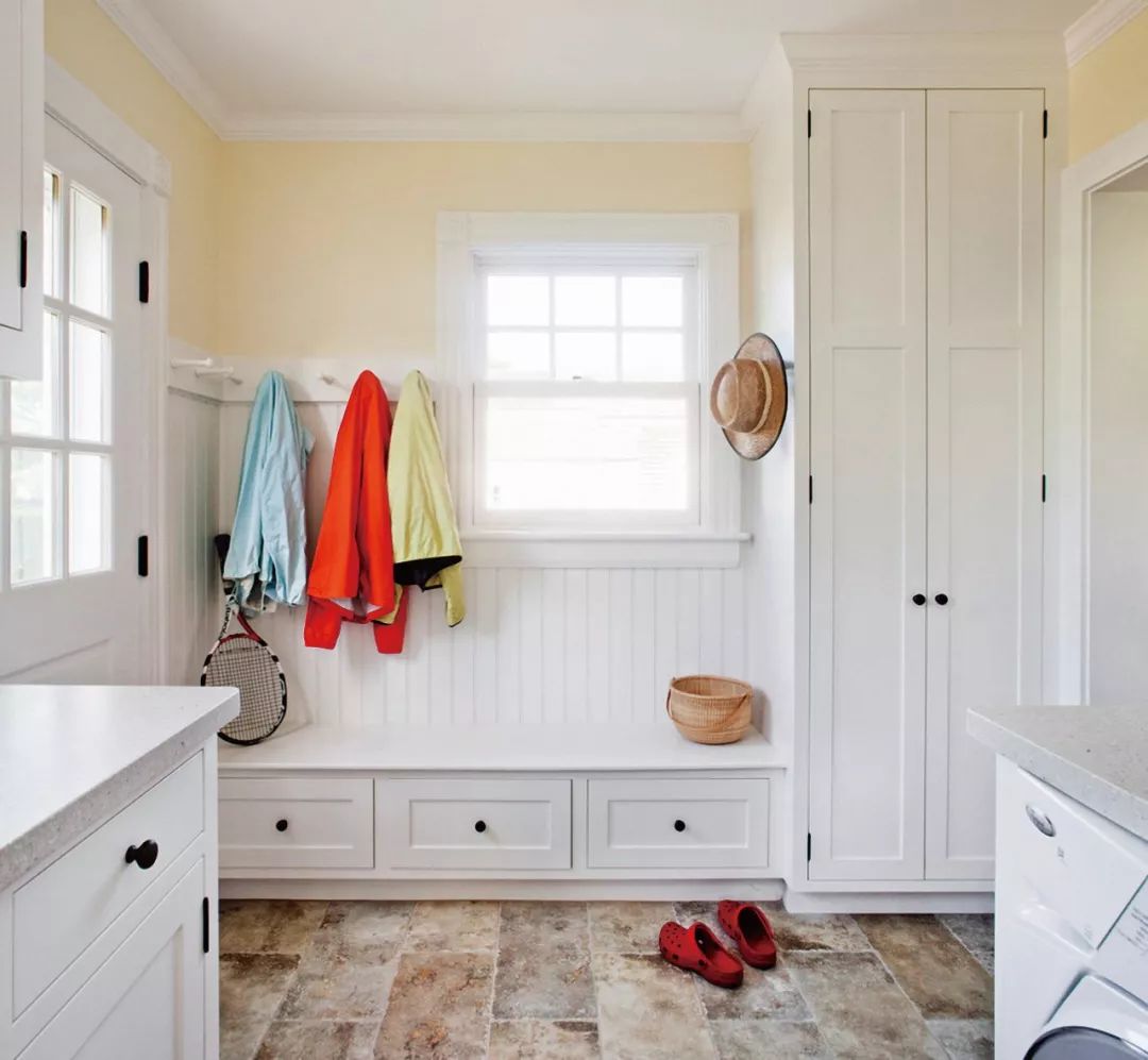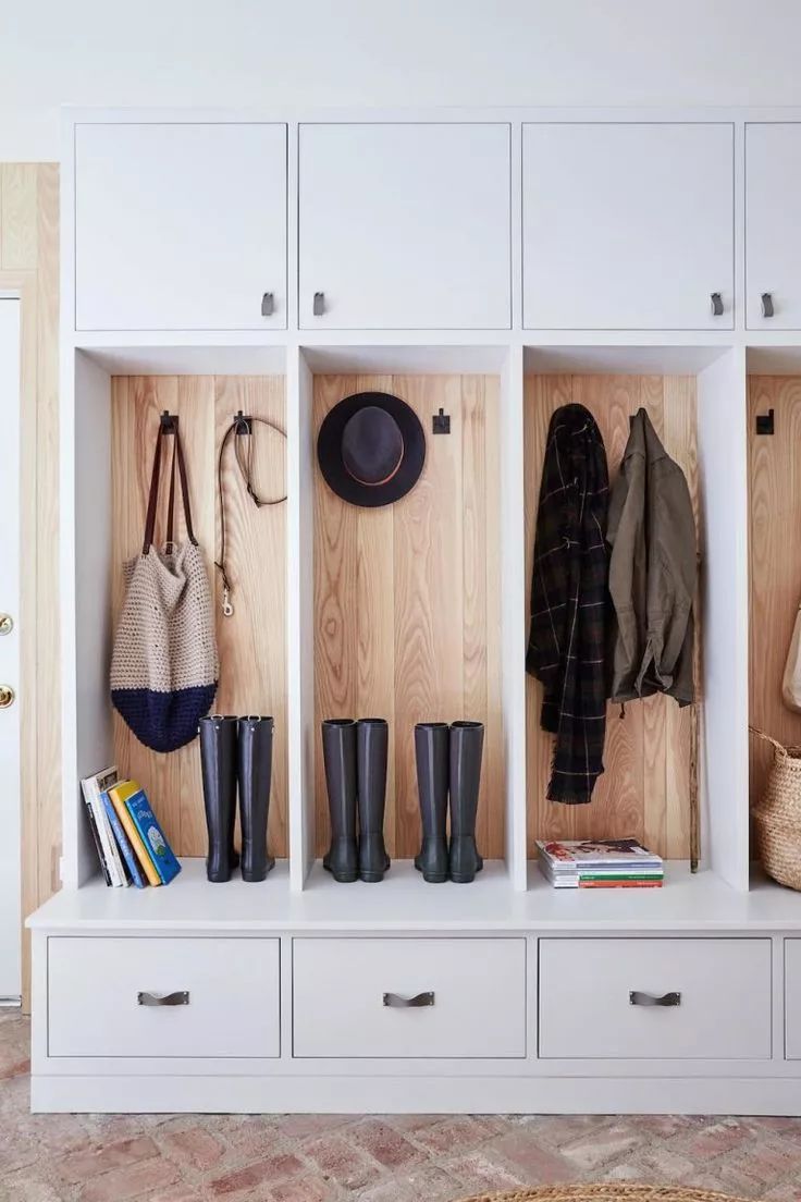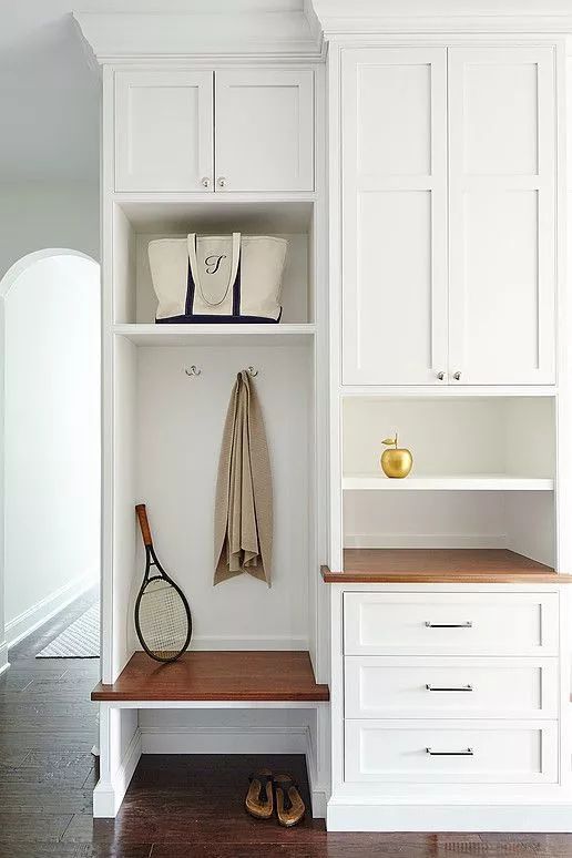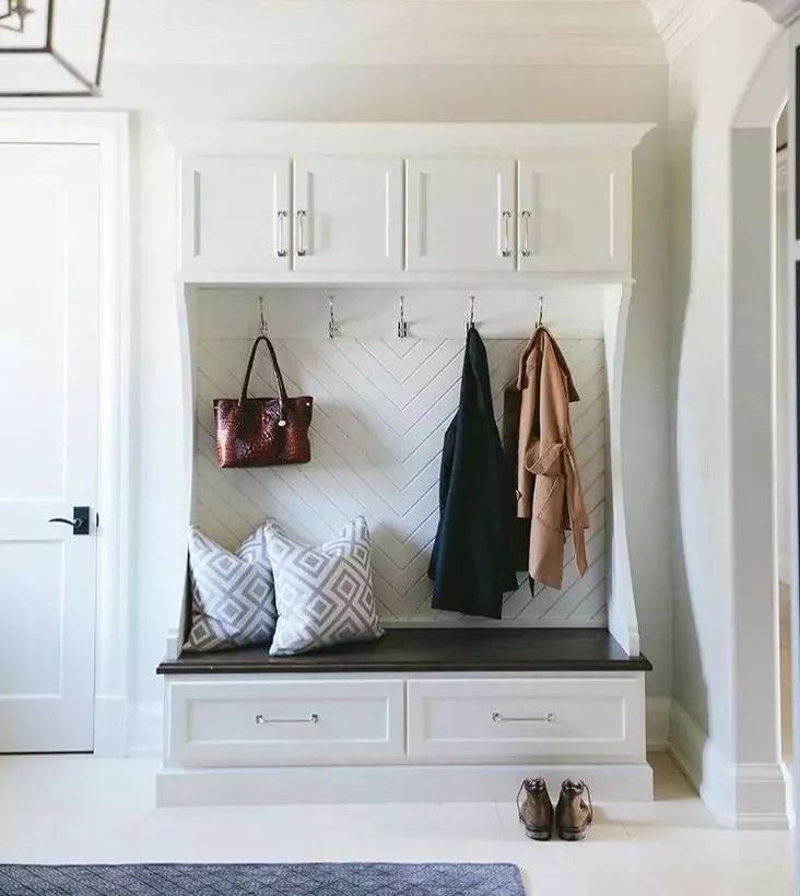 在留空区域安装几个挂钩,外套、帽子、包包等都有了合适的藏身之处,进出门的时候就再也不用跑到别的房间,轻松省事多了。