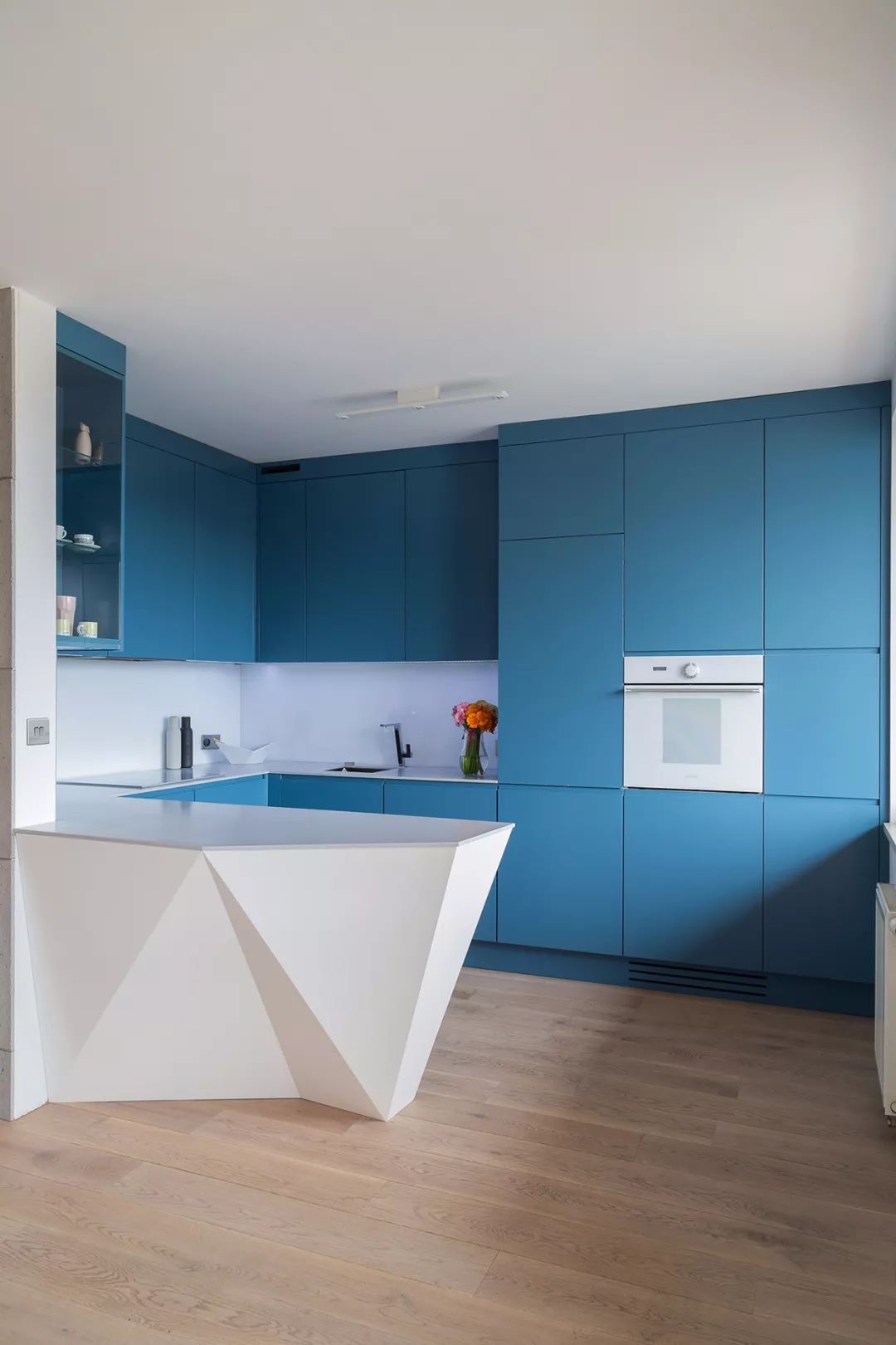蓝色与白色的搭配,也深得时尚人士恩宠。因为它质感舒适而清凉,是一种能够让人沉静下来的颜色,与纯白色组合运用到厨房之中,更是将简约进行到底,凸显出一种海洋色的调性,看起来活力十足。