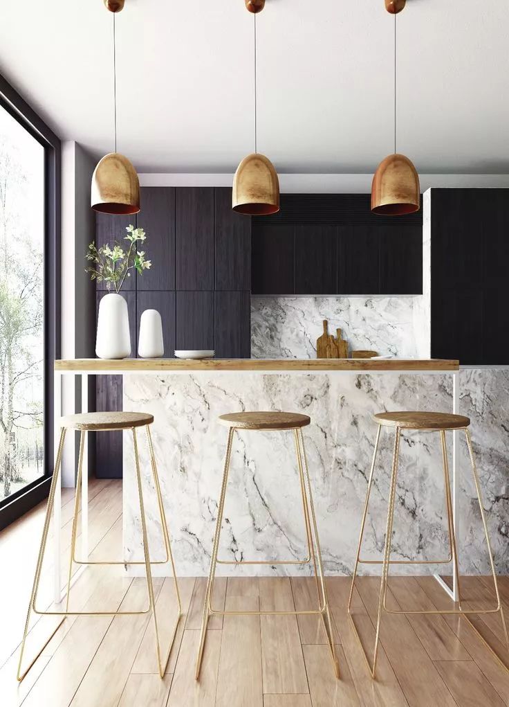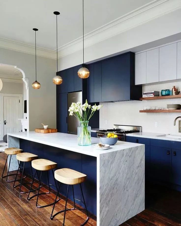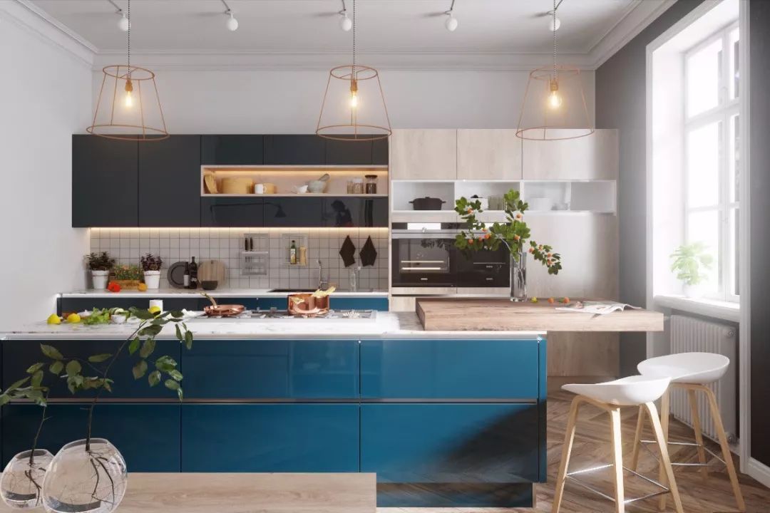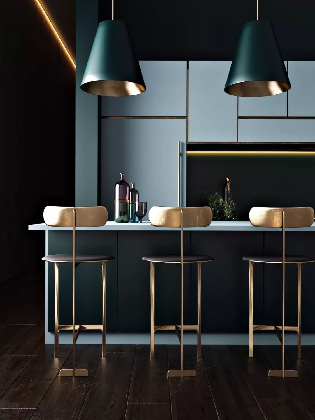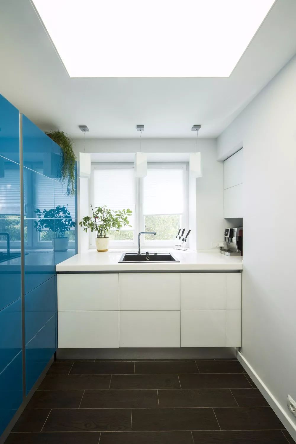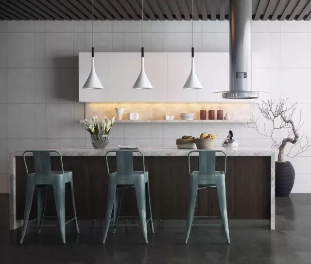蓝色厨房兼具优雅和高冷范儿,它本身的气质比较清新,再加上金属吊灯、大理石元素以及绿植作为装饰,更能打造出一个令人心动的治愈系厨房,让平日日“十指不沾阳春水”的男士,也会忍不住爱上。