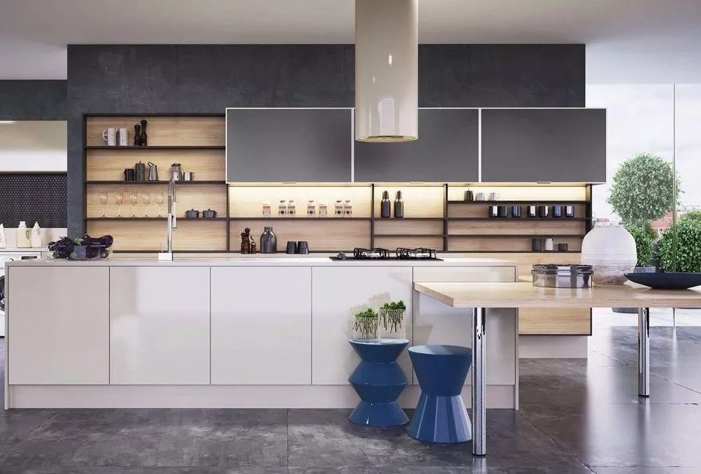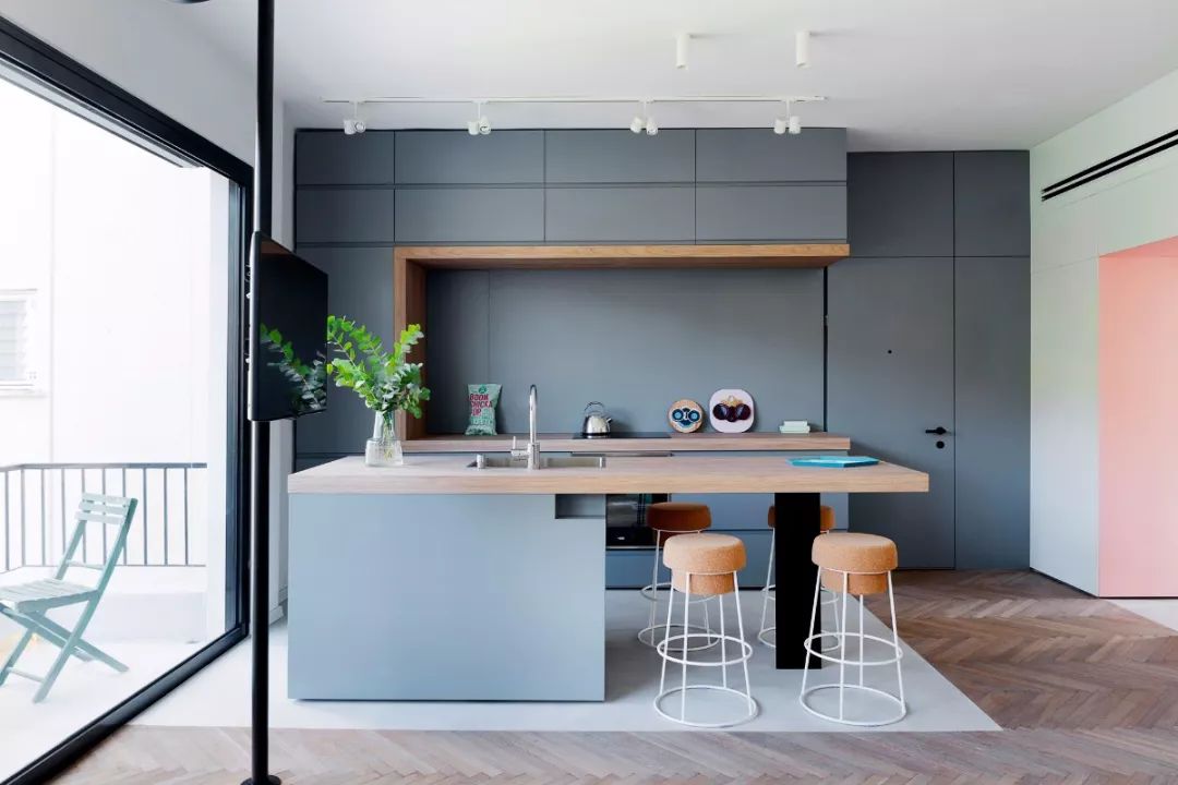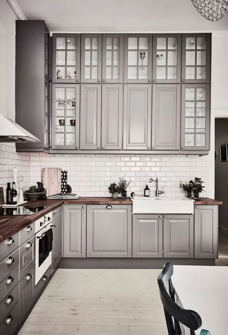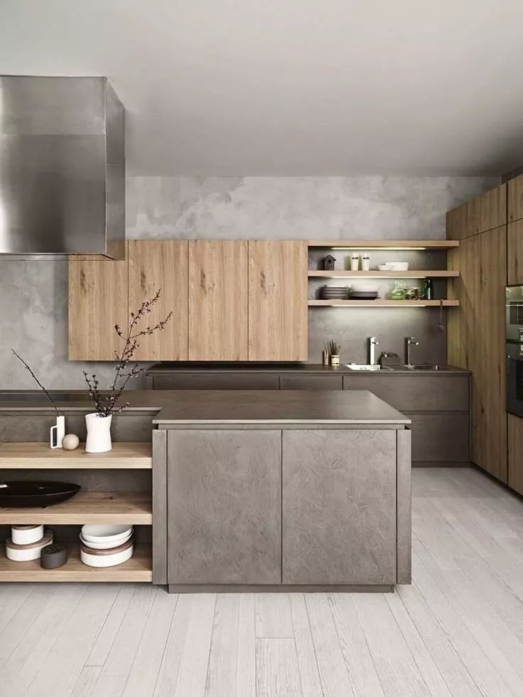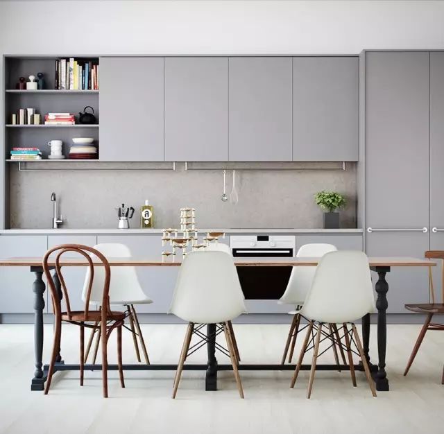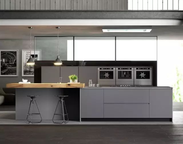 如果你担心大面积的灰色,会让厨房显得有些“清冷”,不妨大胆地加入一些原木材质来点缀,使整个空间看起来更有层次,也瞬间多出几分温暖的味道。