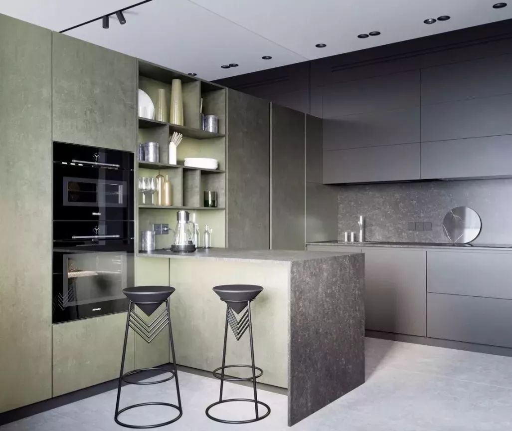 绿色系是一种充满生命力的色彩,低调静谧中传递着一股浓郁的自然气息。为时尚的厨房空间注入一丝活力的青绿色调,营造出符合男士品位的摩登look,那么整个厨房气质就会瞬间提升,更添一份灵动与雅致的魅力。